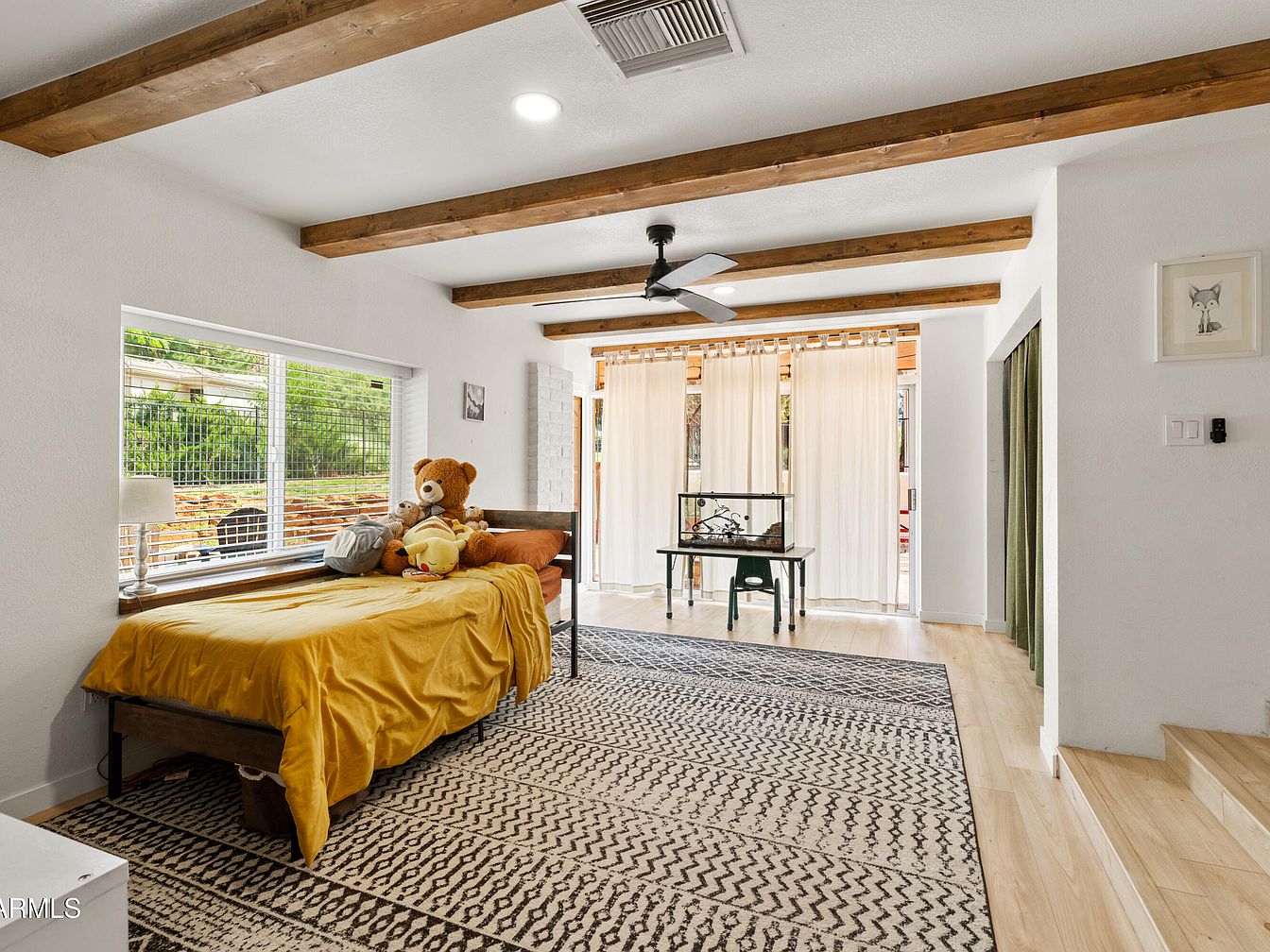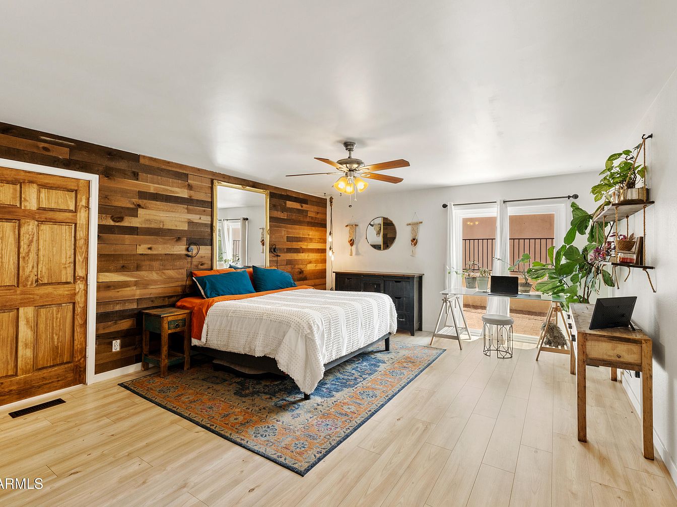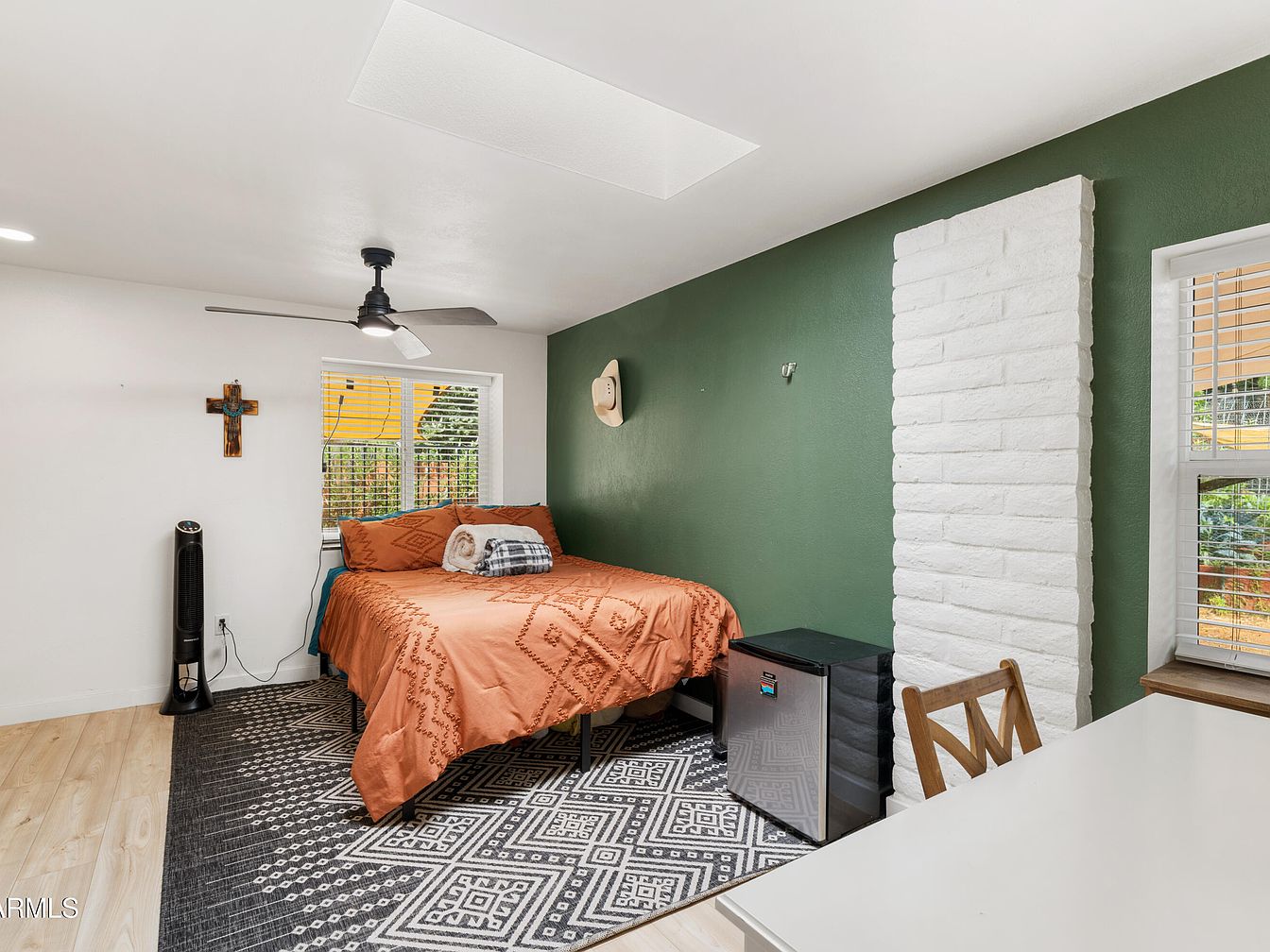 This inviting bedroom blends comfort and style seamlessly. A prominent orange bedspread complements the earthy green accent wall, creating a warm atmosphere that exudes relaxation. Light hardwood floors enhance the sense of space, while a geometric area rug adds texture and visual interest. A ceiling fan ensures airflow, perfect for warm nights, while a small kitchenette with a mini-fridge and dining table caters to convenience. Natural light streams through the window, illuminating the room’s details, including the uniquely textured white stone wall, which adds architectural depth. Family-friendly elements provide both function and comfort, making it an ideal sanctuary.
