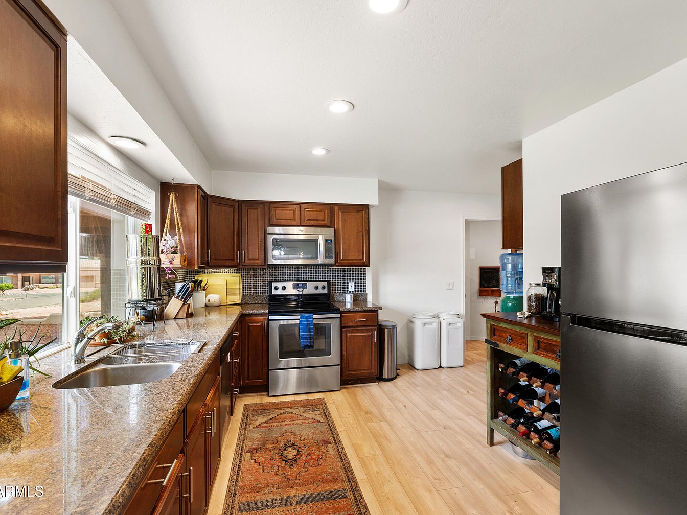 This modern kitchen combines functionality with stylish design, featuring rich wooden cabinetry and sleek granite countertops that offer ample workspace. Sunlight streams through the window, accentuating the vibrant colors of fresh produce displayed in a bowl. Stainless steel appliances, including a range and refrigerator, provide a contemporary feel while ensuring durability. The layout promotes family interaction, with an open flow connecting to adjacent areas. Charming decorative elements, like a patterned area rug and tasteful shelving for wine storage, enhance the aesthetic. The light wood flooring adds warmth, creating an inviting atmosphere perfect for gatherings and everyday cooking.