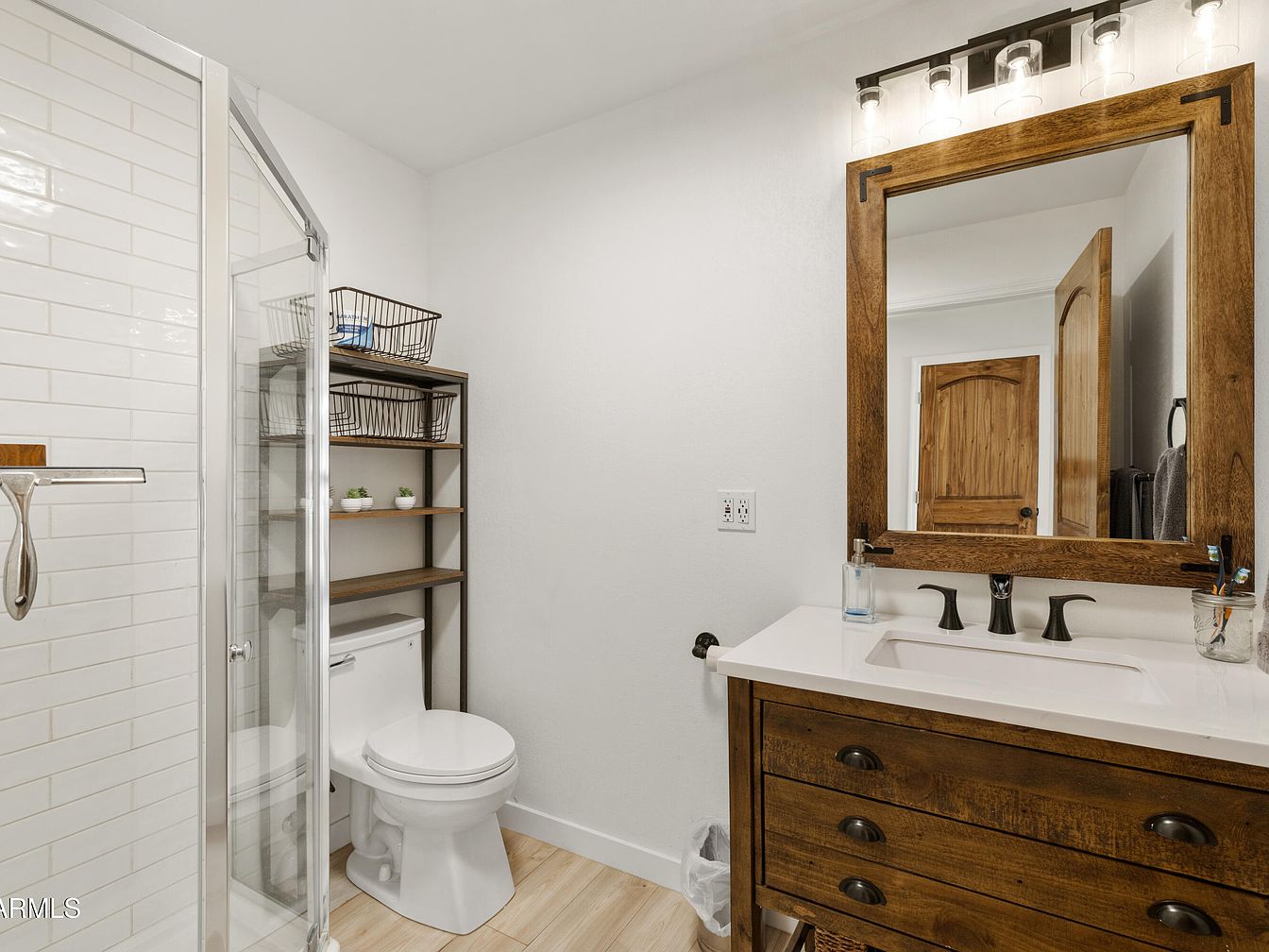 This inviting bathroom features a sleek, modern layout designed for functionality and comfort. A spacious walk-in shower boasts a glass enclosure, showcasing pristine white subway tiles that reflect light beautifully. The rich, wooden vanity adds warmth, complemented by a similarly styled mirror that enhances the rustic charm. Elegant black fixtures contrast the neutral color scheme, creating a stylish yet family-friendly vibe. Practical metal shelving provides ample storage for essentials while adding a contemporary touch. Soft, warm lighting above the mirror illuminates the space, making this bathroom a serene retreat suitable for both relaxation and daily use.