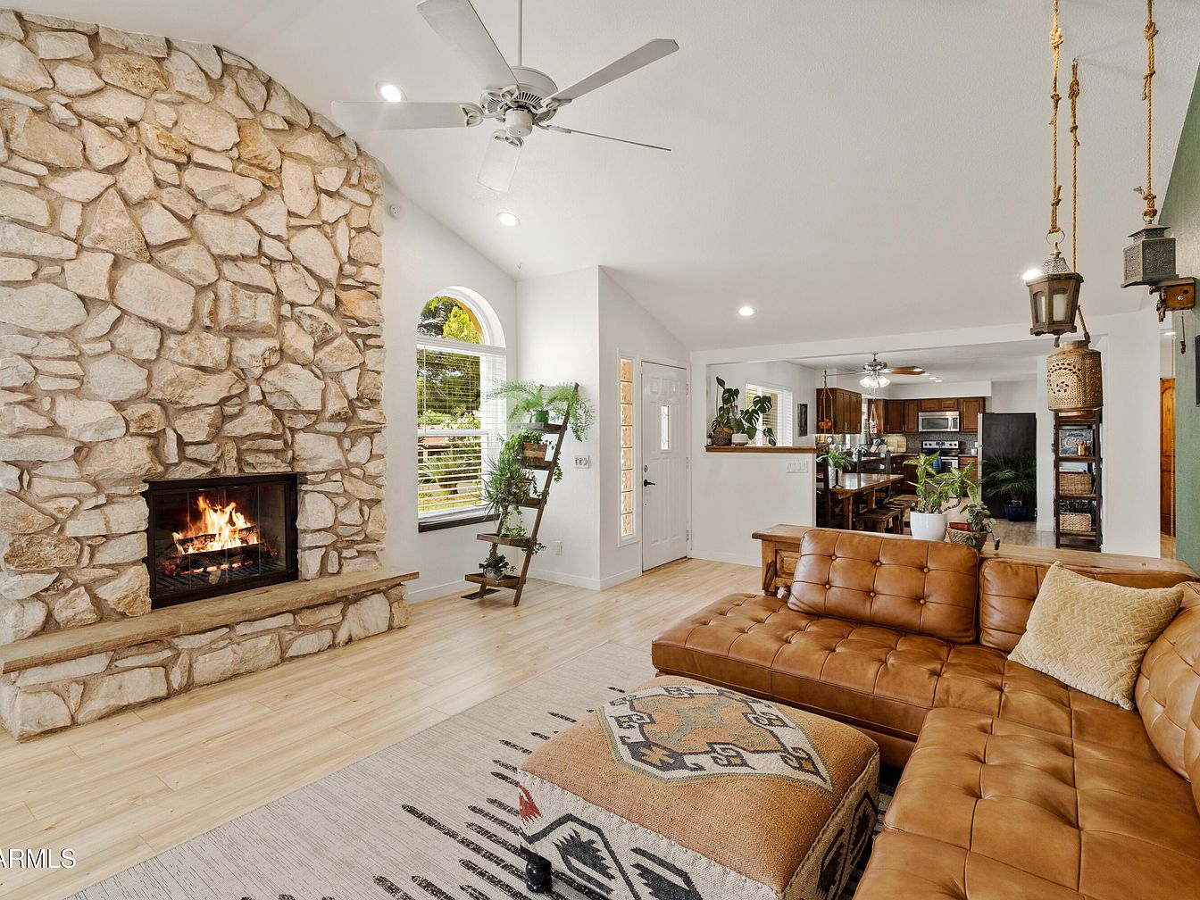 Warm and inviting, this living room features a stunning stone fireplace that serves as a focal point, offering both comfort and aesthetic appeal. The soaring ceilings and large windows provide abundant natural light, creating a bright atmosphere. A luxurious leather sectional invites relaxation, complemented by textured throw pillows for added warmth. The earthy color palette enhances the cozy vibe while woven basket accents add an organic touch. Family-friendly elements include durable hardwood flooring and an open layout that connects seamlessly to the kitchen, perfect for gatherings. Lush greenery brings life to the space, completing this nurturing home environment.