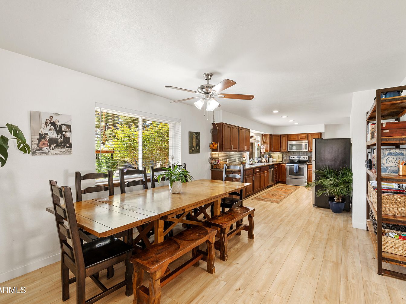 This inviting dining area harmoniously blends comfort and functionality. A robust wooden dining table, capable of hosting family gatherings, takes center stage, accompanied by matching chairs that offer sturdy seating. Light-colored, wide-plank flooring enhances the room’s spacious feel, while natural light pours in through the expansive window, showcasing greenery outside. The modern kitchen, seamlessly integrated, features rich wooden cabinetry and stainless-steel appliances, exuding a contemporary vibe. Decorative elements, such as indoor plants and framed photos on the walls, add personal touches. A ceiling fan suspends above, adding practicality to this cozy family-friendly space, perfect for both meals and memories.