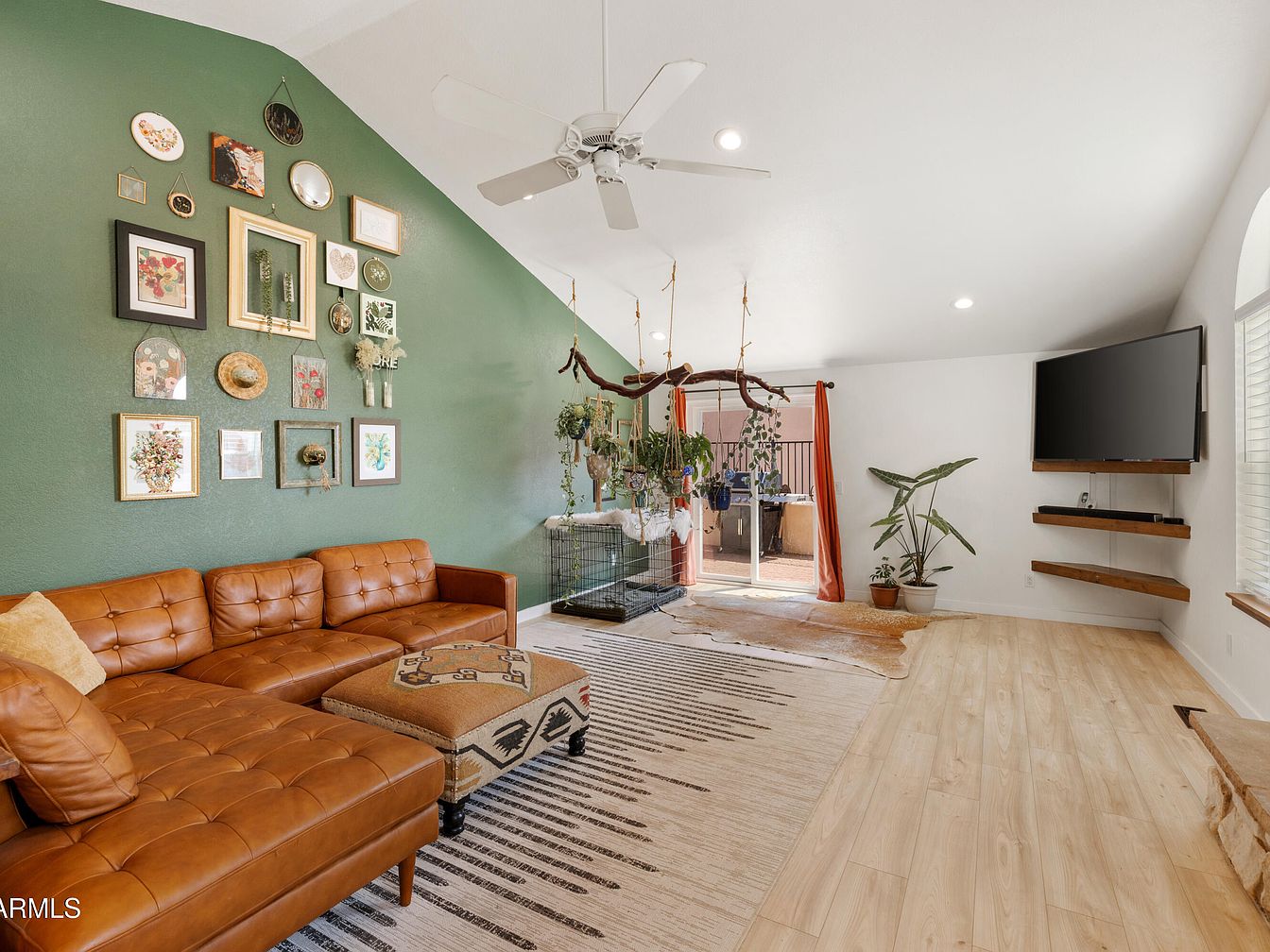 A welcoming living room features a rich green accent wall adorned with an eclectic gallery of framed artworks, enhancing the vibrant character of the space. The stylish leather sectional sofa, complemented by a unique ottoman, invites comfort and family gatherings. Natural light floods the room through expansive windows, illuminating the light wood flooring that creates a warm atmosphere. An organic feel is accentuated by hanging plants and decorative greenery. Modern technology is seamlessly integrated with a wall-mounted TV and open shelving, maintaining a minimalist aesthetic while promoting a cozy environment ideal for relaxation and entertainment.