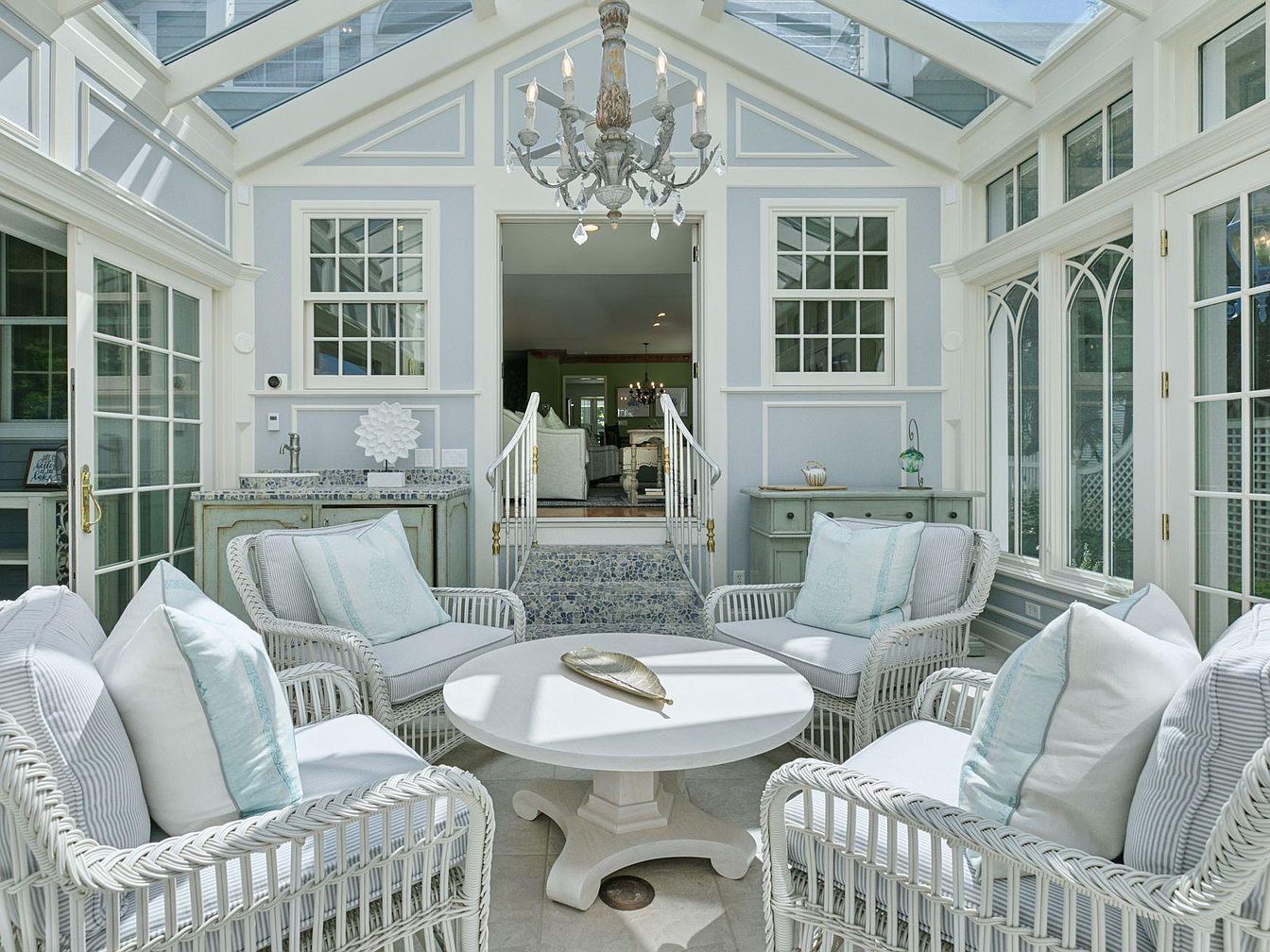 A sun-drenched lounge brings the outdoors inside, featuring wicker seating arranged around a round central table, ideal for family gatherings. The room is enclosed with large picture windows and glass doors, inviting natural light and offering garden views. Soft blue and white hues dominate the decor, creating a serene, airy ambiance complemented by plush pillows for extra comfort. Decorative elements like a textured chandelier, mosaic-tiled floors leading to raised steps, and elegant cabinetry add sophisticated charm. This space is both inviting and practical for families, providing a relaxed environment for conversation, play, or quiet relaxation while staying visually connected to the rest of the home.