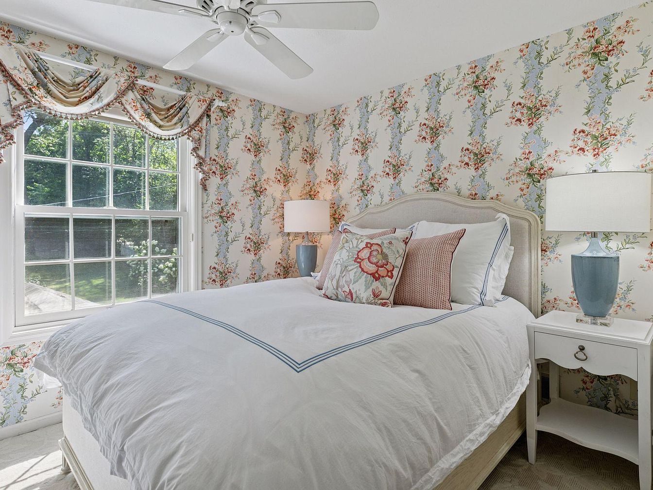 A bright and inviting bedroom highlighted by a large window that fills the space with natural light, creating a cheerful family-friendly atmosphere. The walls are adorned with charming floral wallpaper in soft hues of blue, green, and coral, giving the room a warm and welcoming feel. A plush, upholstered bed stands at the center with crisp white bedding and decorative pillows, blending comfort and style. Matching bedside tables with lamps add symmetry and functionality, ideal for nighttime reading or extra storage. The ceiling fan ensures a cool environment, and the soft, elegant window drapes complete this relaxing sanctuary.