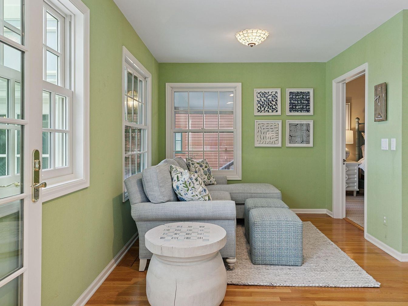 A bright and inviting sitting nook features a modern light gray sectional couch adorned with patterned throw pillows, creating a comfortable environment for relaxing or family gatherings. The light green walls bring a fresh and calming backdrop, while hardwood floors and a large area rug provide warmth and texture. Natural light pours in from large, white-trimmed windows and a glass door, enhancing the airy atmosphere. Wall art arranged in a tidy grid adds visual interest without clutter. The space is thoughtfully arranged with soft, family-friendly furniture and direct access to other rooms, perfect for both adults and children.