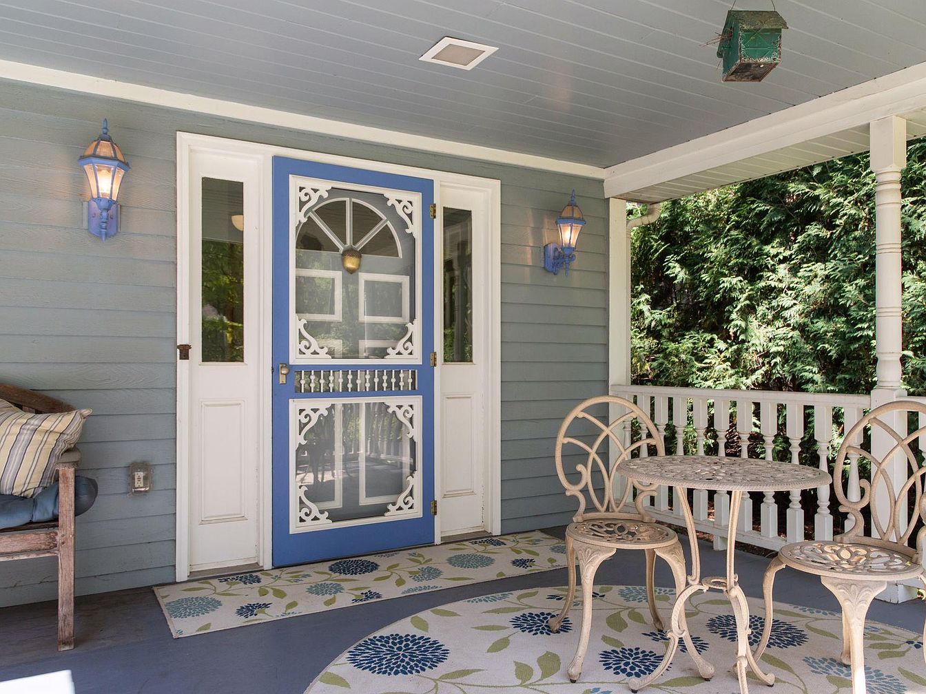Welcoming front porch featuring a charming blue and white screened door framed by glass panels, evoking classic Americana. The space is accented by soft blue siding, white trim, and traditional lantern sconces, adding warmth and a touch of elegance. An inviting bench with patterned cushions and a coordinating wrought-iron bistro set offer comfortable seating perfect for family gatherings or quiet mornings. The floor is adorned with floral-patterned rugs, bringing a playful yet sophisticated touch. Surrounded by lush greenery and bordered by decorative white railings, this porch creates a serene, family-friendly oasis ideal for relaxation and conversation.