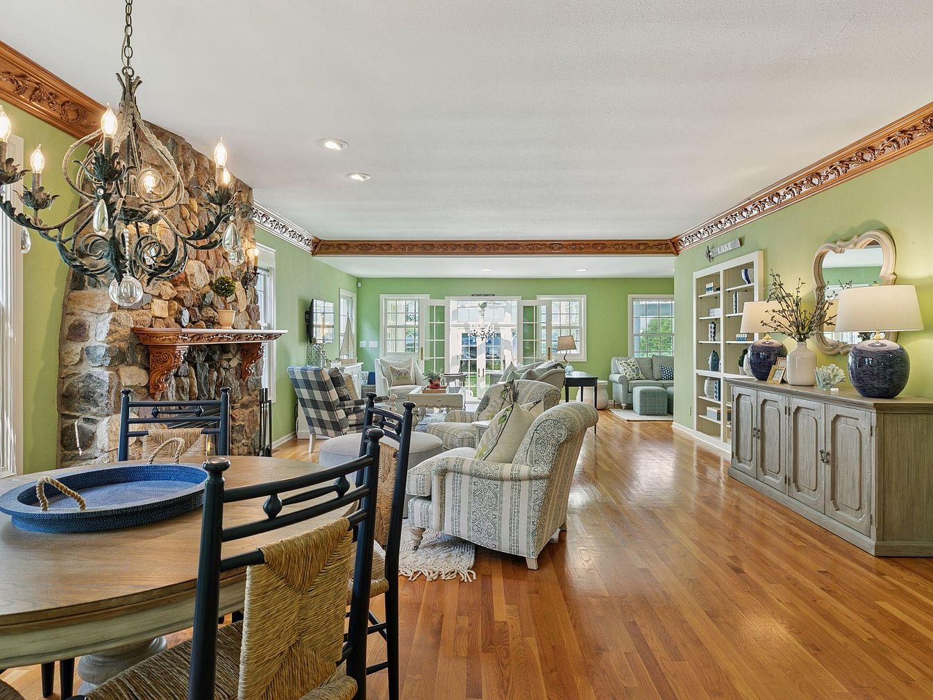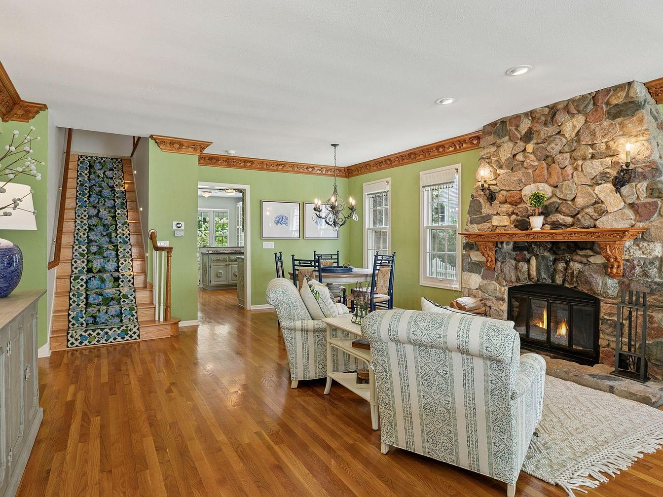 A spacious living room seamlessly blends classic comfort with charming rustic details. Warm hardwood floors stretch throughout the open plan, leading the eye toward a striking floor-to-ceiling stone fireplace, an inviting centerpiece perfect for cozy family gatherings. Soft green walls, paired with ornate natural wood crown molding, create an atmosphere both refined and welcoming. Patterned armchairs and a plush ivory rug add softness and a family-friendly vibe, while nearby, a dining nook with navy chairs sits beside sunlit windows. The staircase, adorned with a colorful floral runner, and built-in shelving provide both functionality and visual interest for daily living.