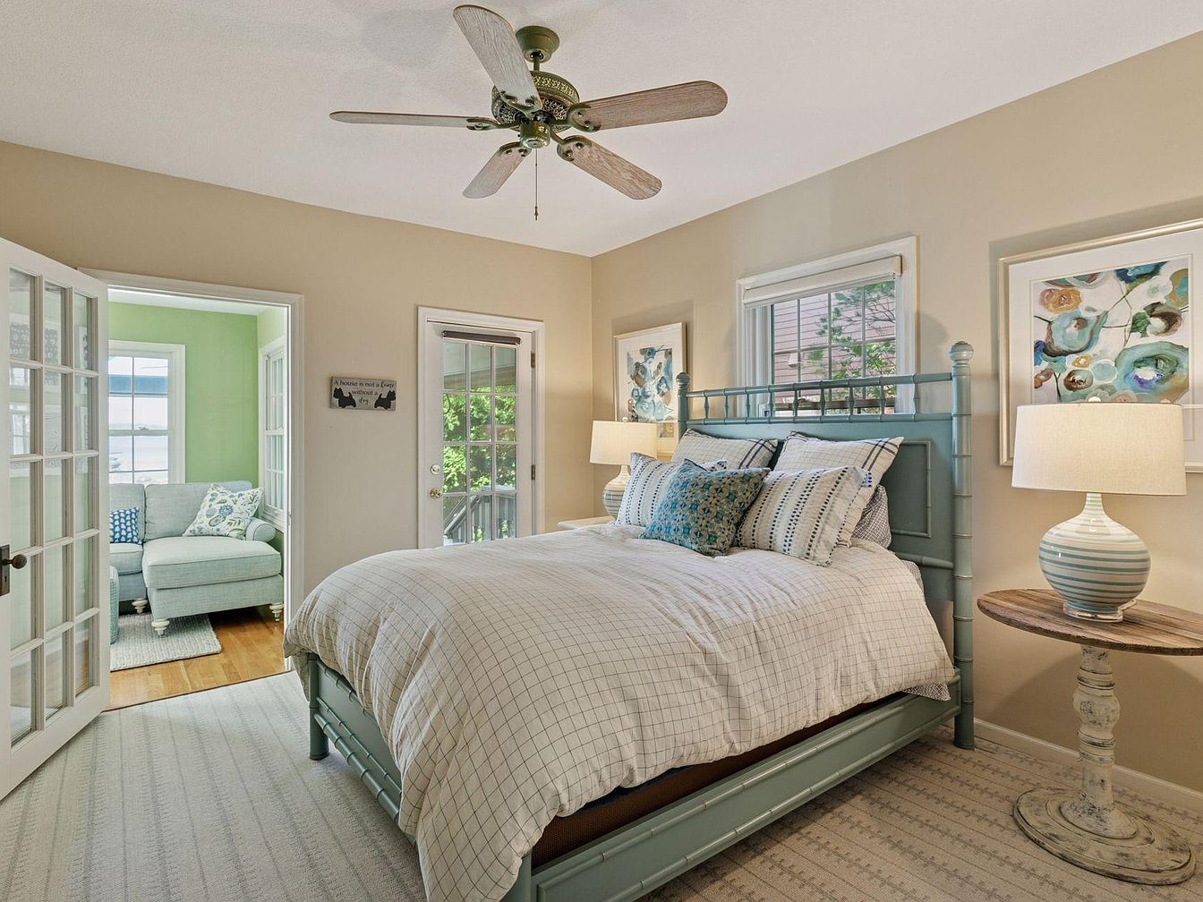 A cozy, sunlit master bedroom with soft neutral walls and a pale blue-green bed frame, this space exudes comfort and relaxation. The bed is dressed in textured linens and layered accent pillows, creating an inviting retreat. Matching lamps on rustic wooden side tables provide warm ambient light, while abstract botanical artwork adds a touch of modern flair. French doors open to a charming sitting room bathed in green hues and natural light, perfect for reading or family time. Neutral carpeting and light wood floors offer a family-friendly feel, making this suite both elegant and practical for everyday living.