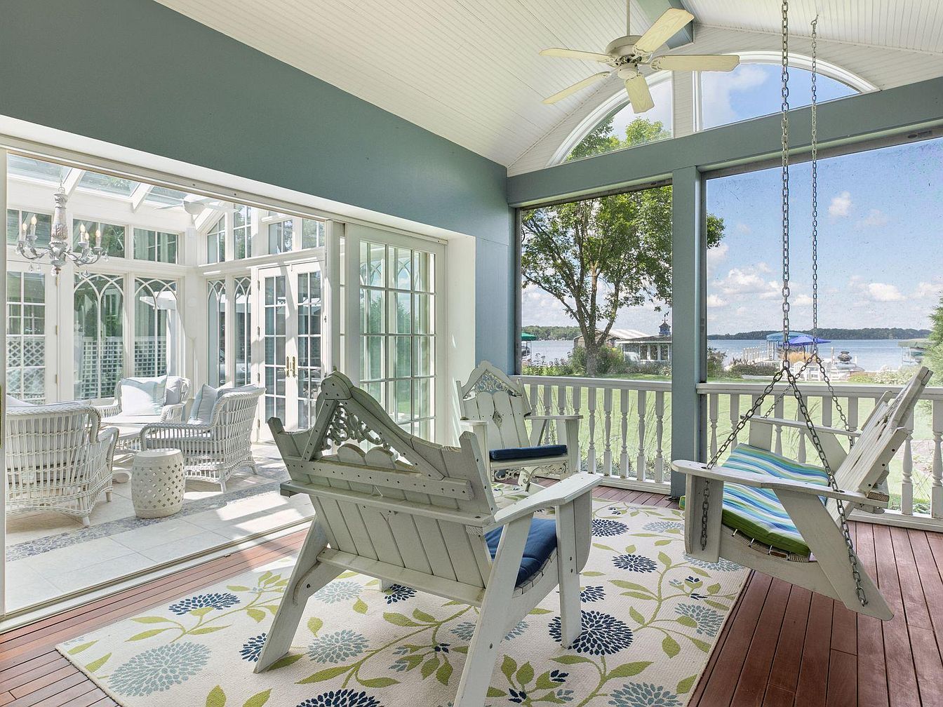 A welcoming screened-in porch is designed for relaxation and enjoyment, featuring charming wooden swing benches accented by striped and solid cushions, perfect for children and adults alike. The space is open and airy, with large windows and glass doors connecting it seamlessly to a bright sunroom filled with white wicker furniture. Gentle pastel blue-green walls complement the crisp white of the ceiling and railings, enhancing the coastal ambiance. The floral patterned rug and ceiling fan provide both comfort and style, while views of the water and lush green yard create a tranquil, family-friendly gathering spot.