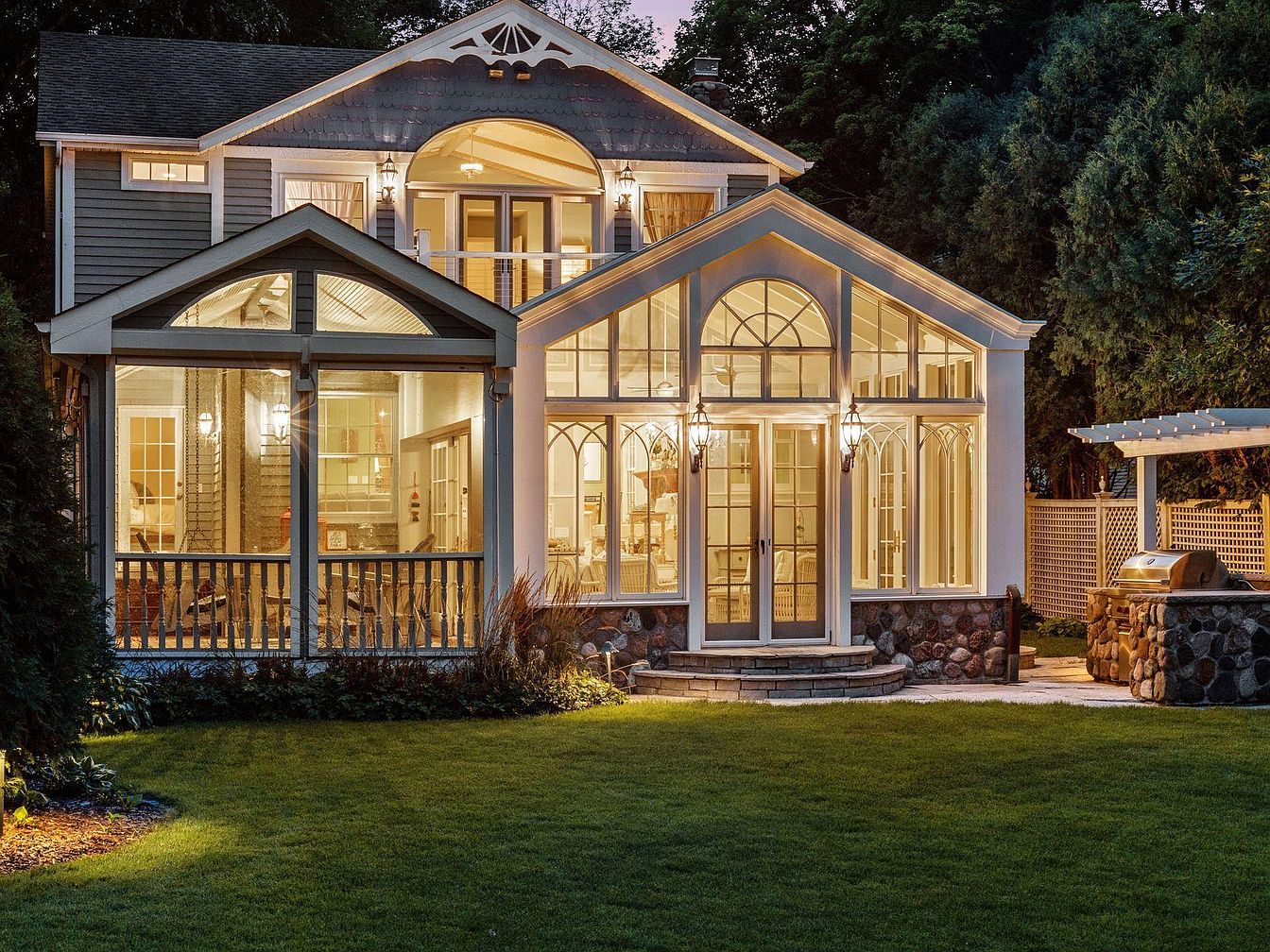 This sunlit sunroom and patio area beautifully brings the outdoors in with soaring windows framed by classic arches, welcoming an abundance of natural light. The exterior combines charming gray siding and crisp white trim, with a warm stone foundation providing visual contrast and a sense of solidity. Offering plenty of family-friendly space, the attached patio with a built-in stone grill makes for inviting gatherings and outdoor meals. The interior glows with soft, warm lighting, revealing an open layout perfect for casual entertaining. Elegant lantern sconces, detailed woodwork, and peaceful landscaping ensure this space feels both timeless and inviting for every season.
