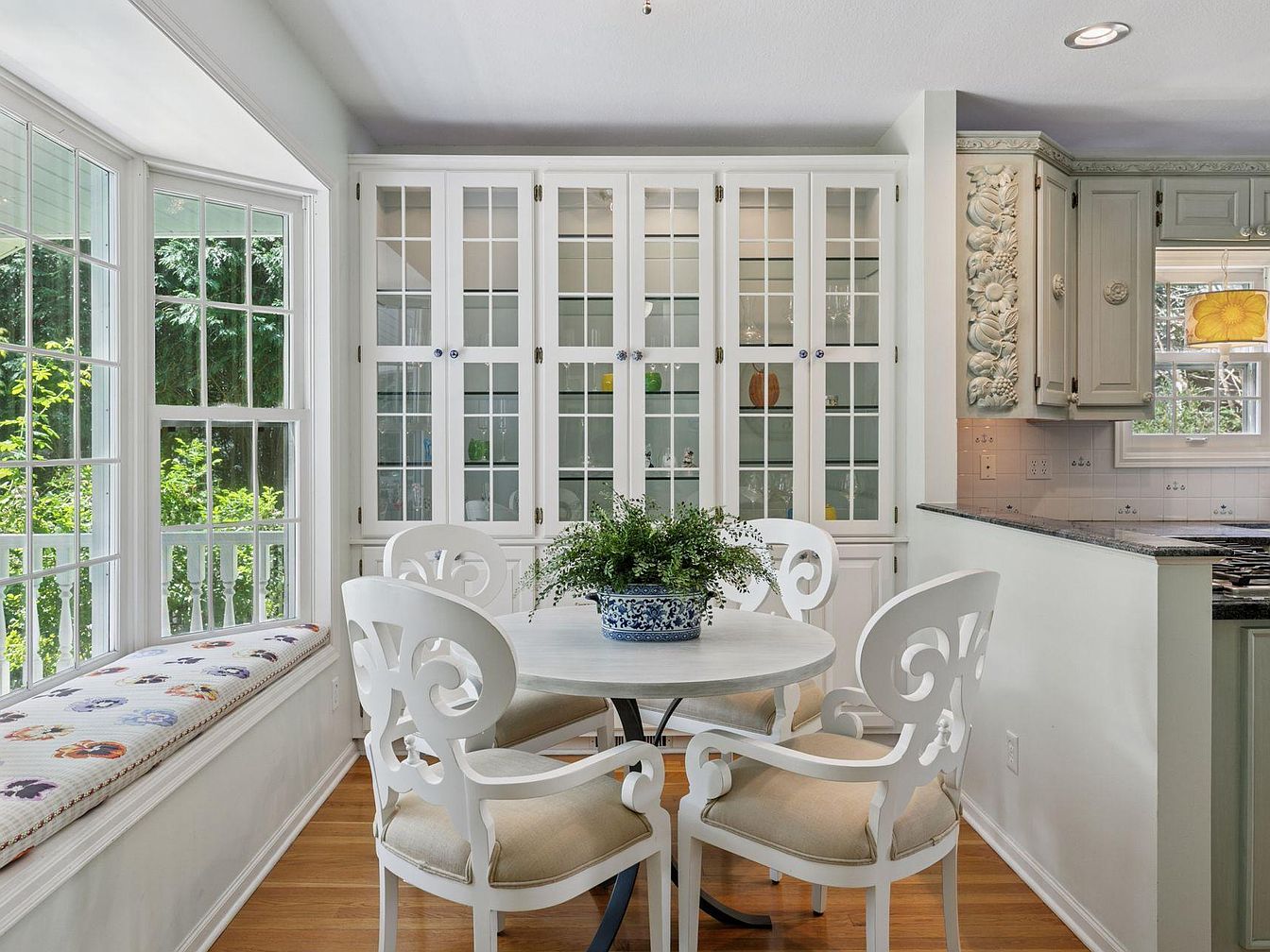 A charming breakfast nook filled with natural light from expansive bay windows, making it an inviting family gathering spot. The cozy window seat adorned with a colorful, patterned cushion offers an excellent perch for relaxing or reading. Immaculate white cabinetry with glass doors provides elegant storage for dishes and collectibles, while the round table and ornate white chairs add a touch of sophistication. Soft beige cushions enhance seating comfort. The adjacent kitchen showcases intricate floral paneling, contributing to the home’s character. A pale, neutral color palette, wood flooring, and harmonious integration with the outdoors create a warm, family-friendly atmosphere.