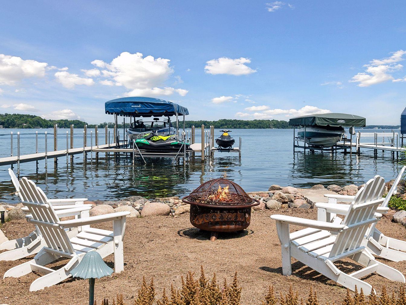 A cozy lakeside retreat designed for unforgettable family moments, featuring four classic white Adirondack chairs arranged in a circle around a charming fire pit. The space merges sandy textures with natural stone accents, creating a casual and welcoming environment perfect for s’mores and storytelling. Just steps away, the private dock extends over tranquil waters and provides easy access to boating and other water activities, making this outdoor area family-friendly and versatile. Soft blue skies and lush lakeshore views complete the inviting color palette, offering an idyllic setting for relaxation and outdoor gatherings with loved ones.
