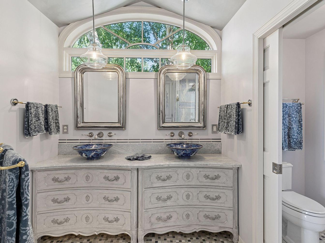 Classic elegance meets functional design in this bathroom featuring a double vanity with French-inspired cabinetry and ornate drawer detailing. Twin mirrors with silver frames hang beneath arched windows, allowing natural light to stream in, creating a bright and inviting atmosphere perfect for family routines. Striking blue-and-white vessel sinks add a pop of color and sophistication, complemented by patterned towels and soft gray walls. The mosaic tile flooring introduces subtle texture, while pendant lights above the sinks provide a warm ambiance. Ample countertop and storage space offers practicality, making this bathroom ideal for shared family use.