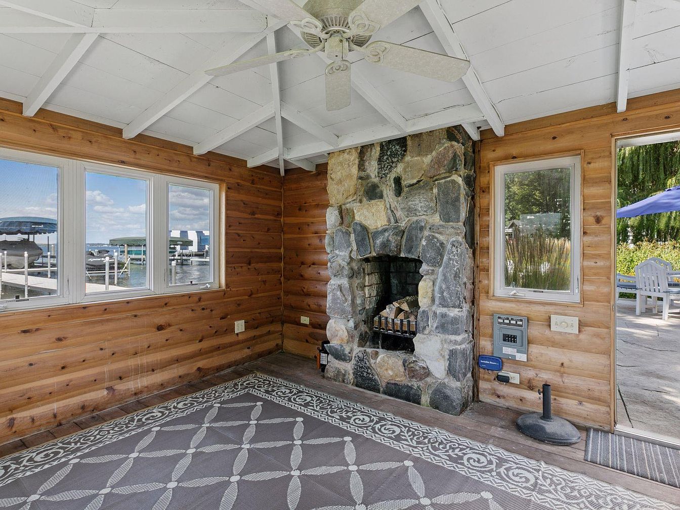This cozy sunroom captures the essence of lakeside living with its panoramic windows offering stunning water views and abundant natural light. The space combines rustic charm with comfort, featuring knotty pine wood walls and a grand stone fireplace as its centerpiece, perfect for gathering with family on cool evenings. The white vaulted ceiling with exposed beams adds brightness and an open feel, while a decorative patterned rug grounds the room with a touch of elegance. Easy access to both the patio and dock makes it an inviting spot for both relaxation and entertaining in any season.