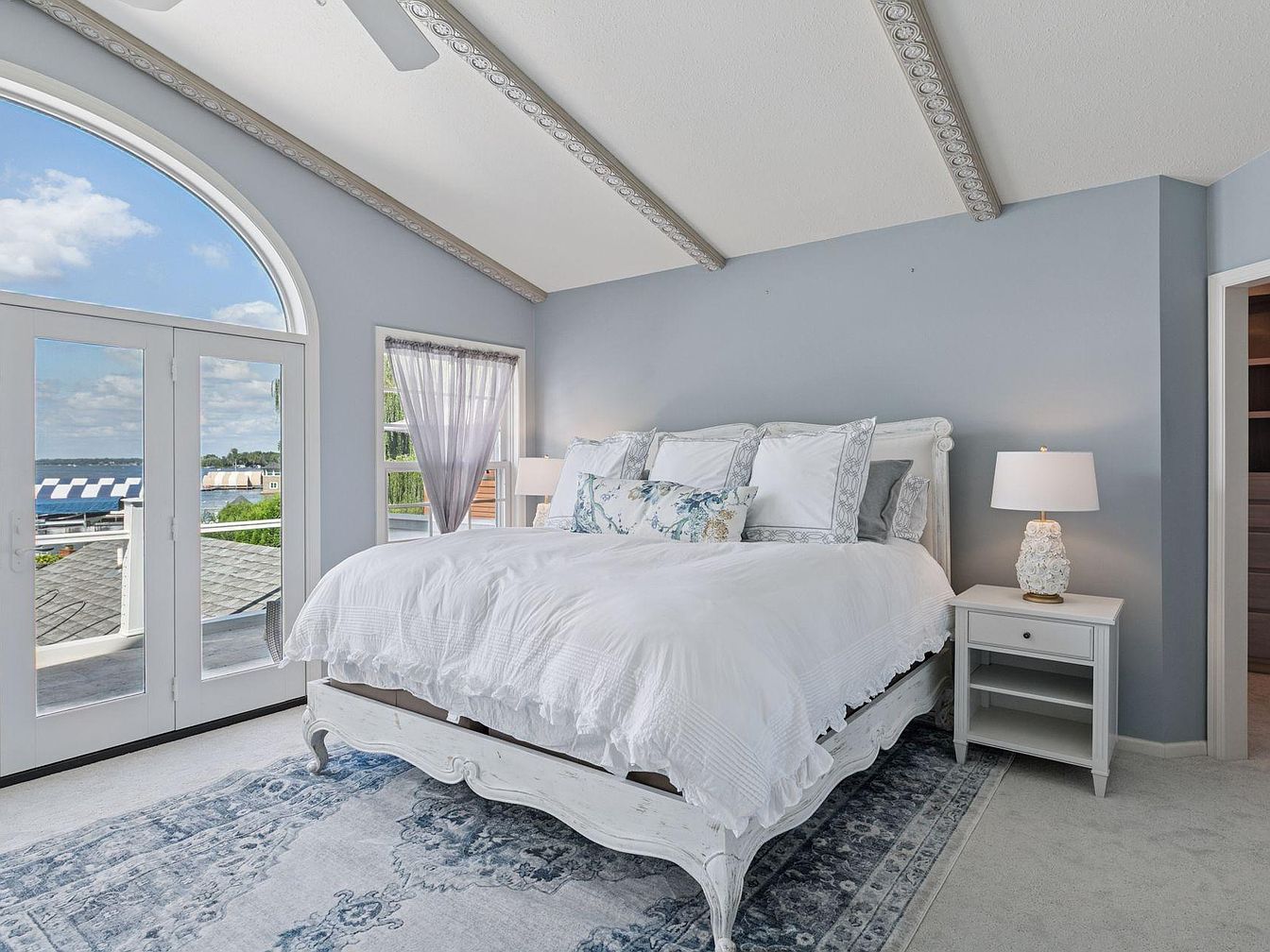 Soft hues of powder blue and crisp white create a serene and peaceful atmosphere in this spacious master bedroom. An ornate white bed with detailed woodwork is dressed with fluffy bedding and decorative pillows, complemented by matching nightstands topped with elegant lamps. The vaulted ceiling features charming exposed beams with intricate detailing, adding architectural interest. Large French doors and an arched window bathe the room in natural light while offering stunning water views, making the space perfect for family relaxation and restful nights. Plush carpeting and a patterned rug provide comfort, making it a cozy and inviting sanctuary.