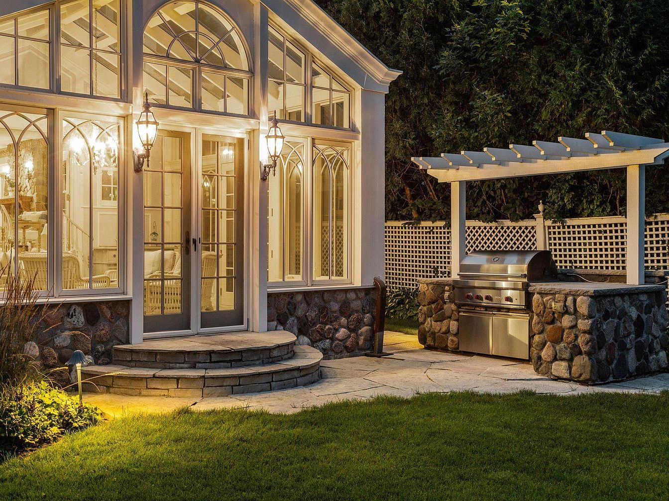 A charming outdoor patio flows seamlessly into a sunroom adorned with grand, floor-to-ceiling windows and elegant double doors framed by classic stonework. The space features soft ambient lighting from traditional lantern sconces, enhancing the inviting and warm atmosphere. The stone steps lead to a spacious paved area with a built-in grill set beneath a white pergola, perfect for family barbecues. The surrounding lush greenery and privacy fencing offer a secure, kid-friendly environment. The design beautifully blends rustic stone textures with graceful architectural lines, making it equally suitable for entertaining guests or peaceful evenings at home.