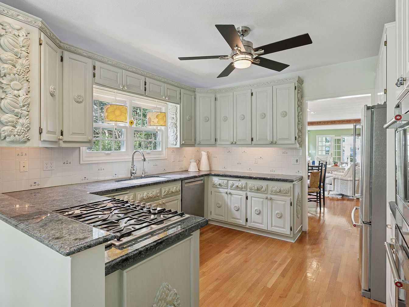 A spacious and inviting kitchen showcases ornate cabinetry with intricate floral moldings and stylish hardware, adding a touch of traditional elegance. The L-shaped granite countertops provide ample workspace for meal preparation and family gatherings. Warm hardwood floors give the space a cozy and welcoming feel, while a ceiling fan ensures comfort. Large windows above the sink let in natural light, creating a bright and airy atmosphere ideal for busy family routines. Stainless steel appliances offer modern convenience, and the open layout keeps the kitchen connected to the dining and living areas, making it perfect for family living.