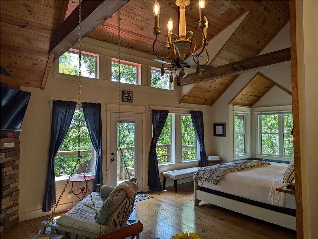 A spacious and inviting bedroom blends comfort and style with its vaulted, white plank ceiling accented by exposed wooden beams and a classic chandelier. Large windows fill the space with natural light and offer tranquil views of lush greenery, making it perfect for family relaxation. A plush, tufted headboard anchors the king-size bed, complemented by soft neutral bedding and accent pillows. A cozy sitting area with a loveseat and a whimsical hanging chair create versatile lounging spots for both adults and children. Warm wooden floors, a patterned rug, and a touch of greenery add to the room’s welcoming ambiance.