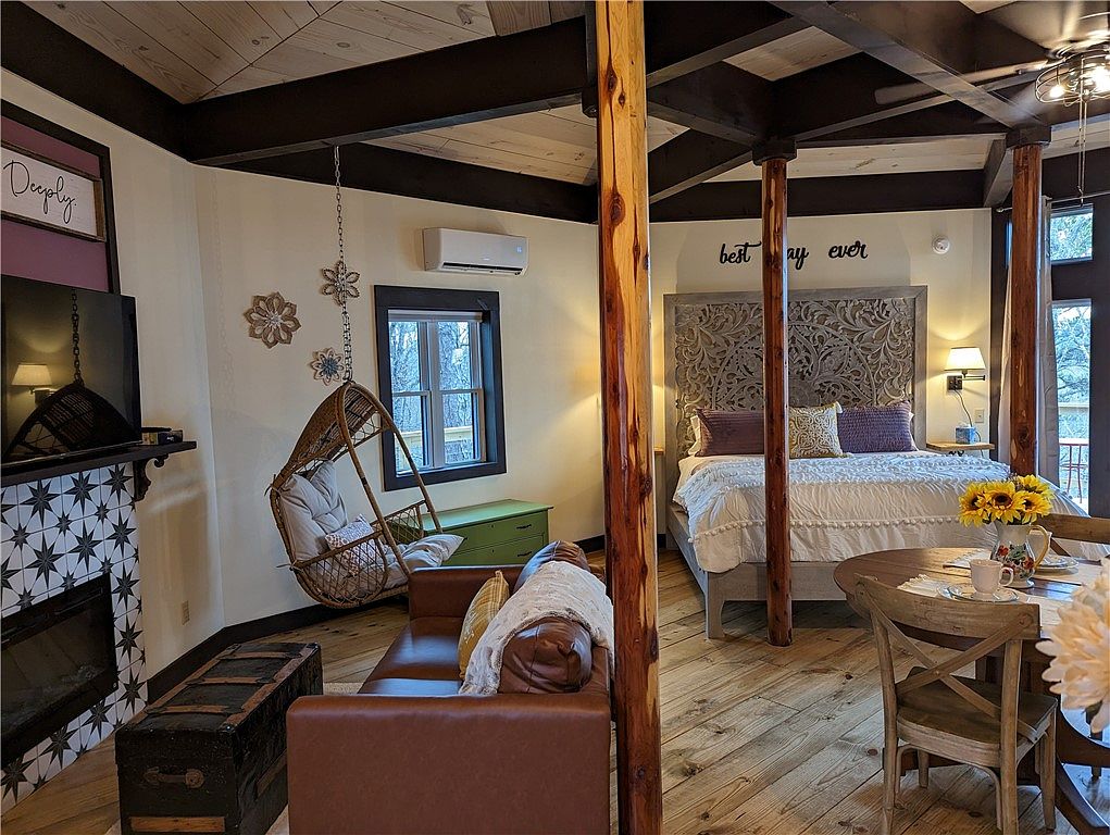 Warm, rustic beams frame this inviting open-plan bedroom suite where natural light streams through multiple windows. The centerpiece is a king bed with an intricate carved headboard, accented by plush pillows and soft bedding. Family-friendly touches include a comfy leather loveseat and a playful hanging chair for lounging or reading. The space combines farmhouse and modern flair with a patterned tile fireplace and weathered wood floors. A small round dining table with sunflowers adds charm and functionality, making it perfect for meals or game nights. Soft cream walls, thoughtful decor, and cozy textiles create a restful yet welcoming retreat for all ages.