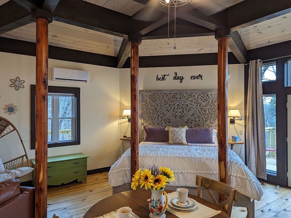 This master bedroom features a warm, inviting design with rustic wooden beams framing the ceiling and a statement four-poster bed. The carved wooden headboard, adorned with plush pillows, is accented by a whimsical “best day ever” sign, adding a cheerful touch. Large windows let in natural light, while soft neutral walls and exposed wood floors create a bright, open feel. Family-friendly touches include a spacious seating nook and a dining table perfect for snacks or family board games. Decorative wall art, thoughtful lighting, and cozy linens complete the space’s welcoming, comfortable ambiance—ideal for both relaxation and family time.