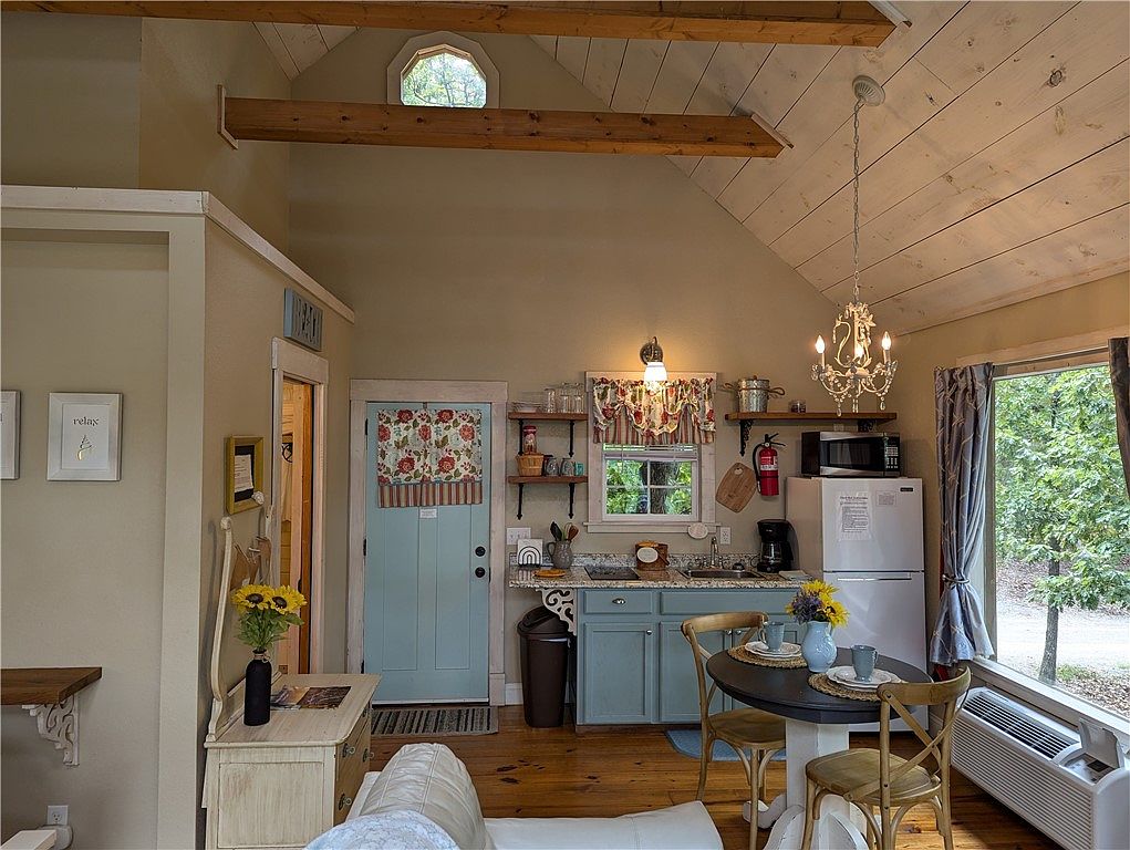 A warm and inviting kitchen and dining nook, featuring light blue cabinetry, country-style floral curtains, and open shelving adorned with jars and essentials. Natural light pours in through a window and a glass-paneled door, complemented by a large picture window framed with soft blue drapes, perfect for family gatherings. The round dining table seats four, highlighted by a charming chandelier overhead. Neutral walls and exposed wooden beams on the vaulted ceiling add rustic character. Sunflowers in vases and thoughtful décor touches create a welcoming, homey atmosphere—ideal for families or small gatherings in a well-lit, multifunctional space.
