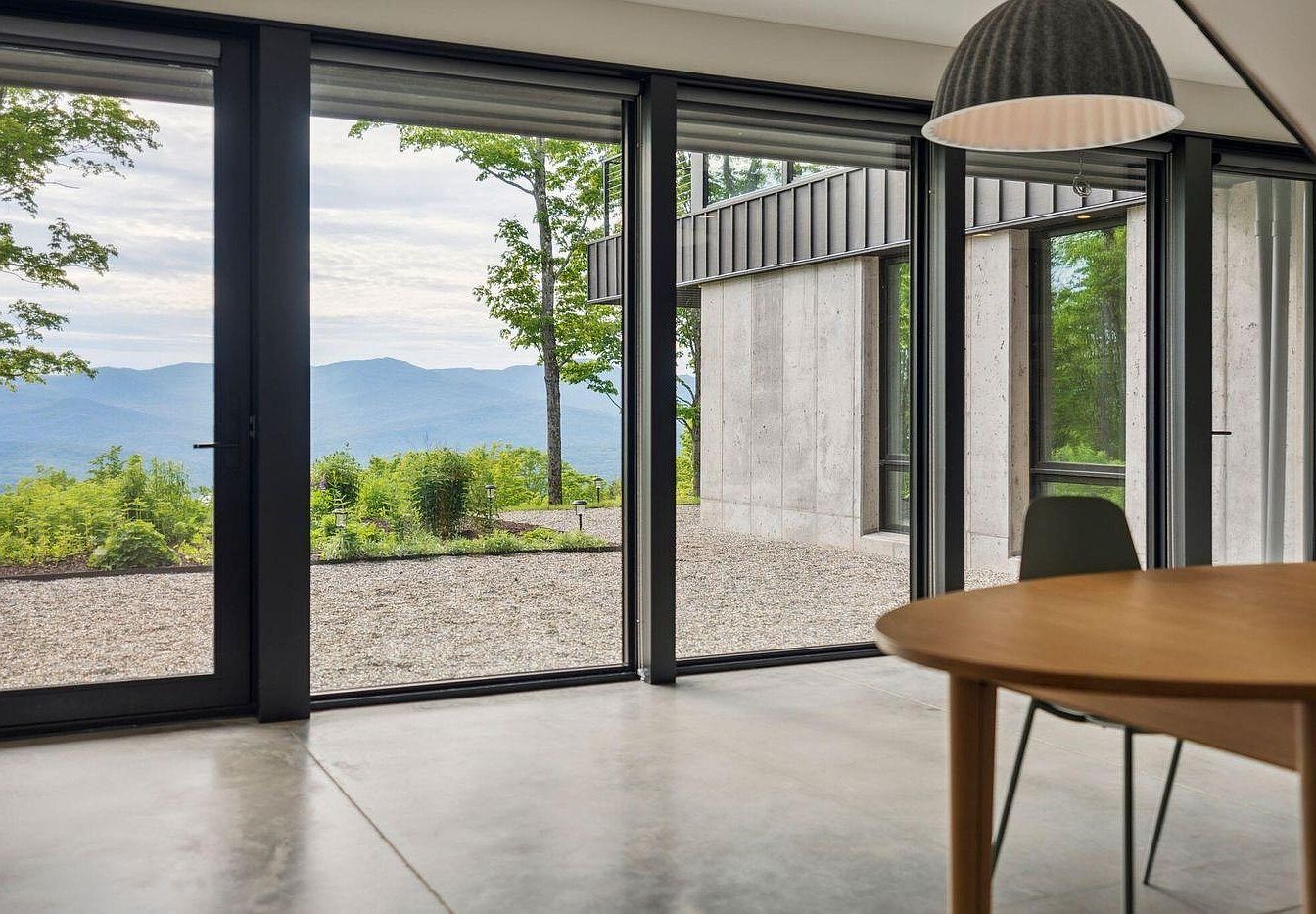 Floor-to-ceiling glass doors create an effortless transition between indoor and outdoor living, bathing the dining area in natural light while offering panoramic mountain scenery. The minimalist yet warm decor features polished concrete floors, a round wooden table, and modern black-framed chairs, perfect for shared family meals and easy cleanup. Soft neutral tones amplify the spacious, airy ambiance, complemented by a large, textural pendant lamp overhead. The wide, open layout allows plenty of room for children to move around, while the proximity to the patio and garden makes it ideal for family gatherings and outdoor play.