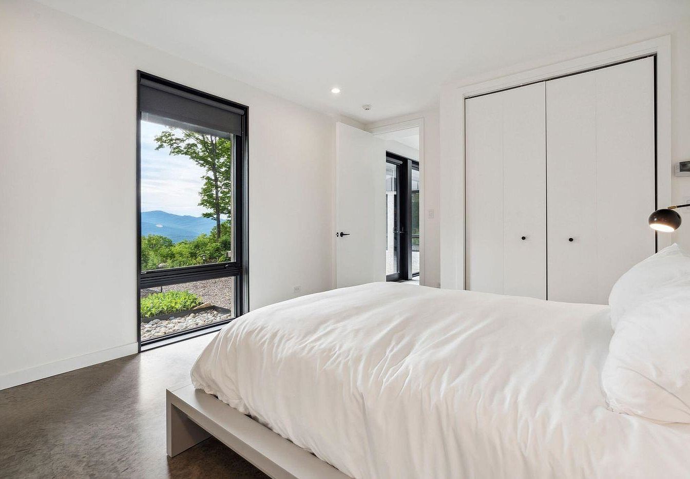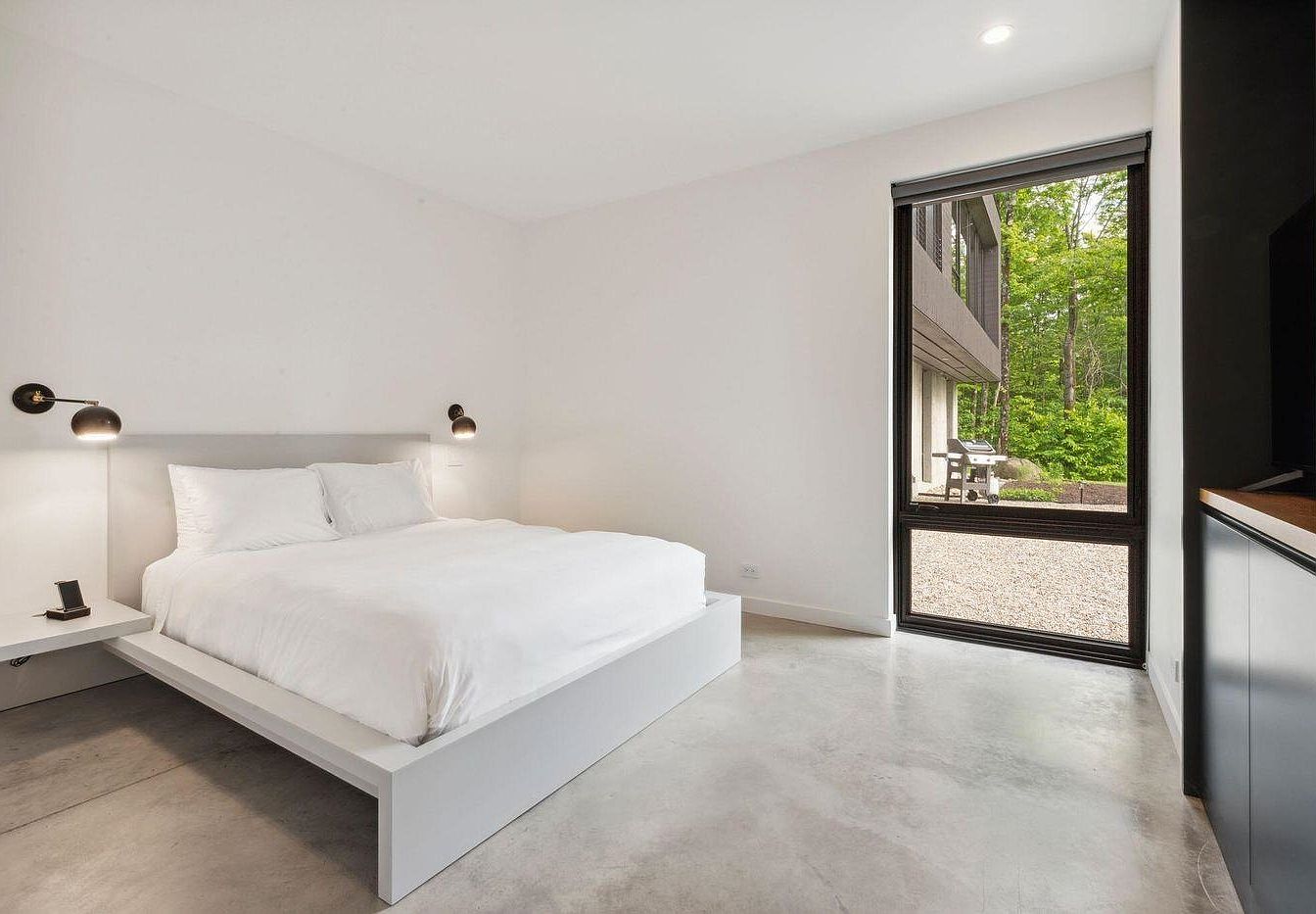 This serene bedroom features a minimalist design highlighted by crisp white walls and concrete flooring that adds a modern edge. A sleek platform bed dressed in white bedding anchors the space, flanked by floating nightstands and contemporary sconces for subtle illumination. Large windows invite natural light and offer picturesque woodland views, creating a calming atmosphere. The open layout and absence of clutter make the room both family-friendly and versatile, ensuring safety and ample space for movement. The neutral palette and understated furniture contribute to a tranquil and welcoming environment perfect for unwinding or sharing quiet family moments.