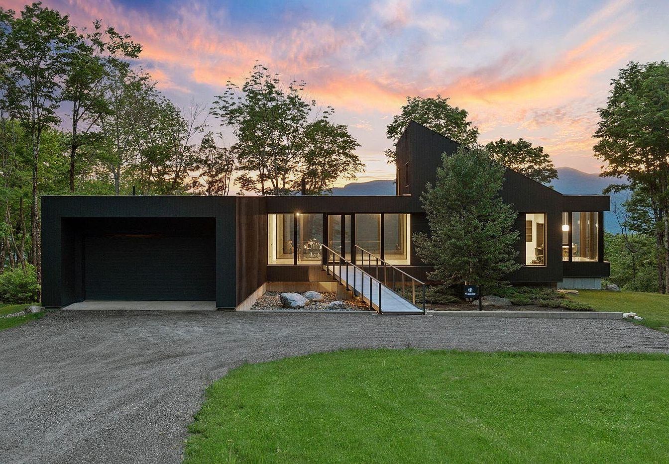 A strikingly contemporary facade merges clean lines and geometric shapes, enhanced by dark cladding that contrasts beautifully with the lush greenery and warm sunset. Expansive floor-to-ceiling windows flood the interior with natural light, offering panoramic views and seamlessly connecting indoor and outdoor living. A wide, accessible ramp leads directly to the entryway, reflecting thoughtful design for families with children or mobility needs. The attached garage provides practical convenience. Minimalist landscaping with natural stones and carefully placed trees softens the architecture, while the overall setting evokes tranquility and modern sophistication, perfect for family life surrounded by nature.