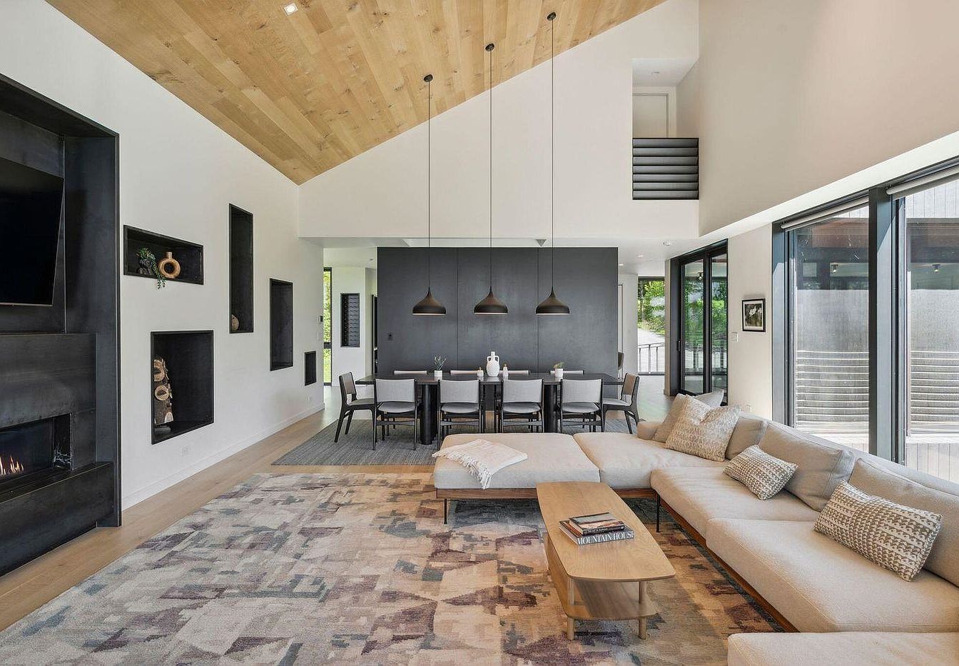 This open-concept living and dining area features a stunning blend of modern comfort and family-friendly design. Wide windows line the space, pouring in natural light and creating a seamless connection to the outdoors. Warm wood tones in the sloped ceiling and floor add organic charm, while a large modular sectional encourages gathering and relaxation. Geometric niches and a sleek built-in fireplace add architectural interest. The dining area is anchored by a bold black accent wall and a long table that easily seats ten, illuminated by sculptural pendant lights, making it perfect for hosting family meals and casual get-togethers alike.