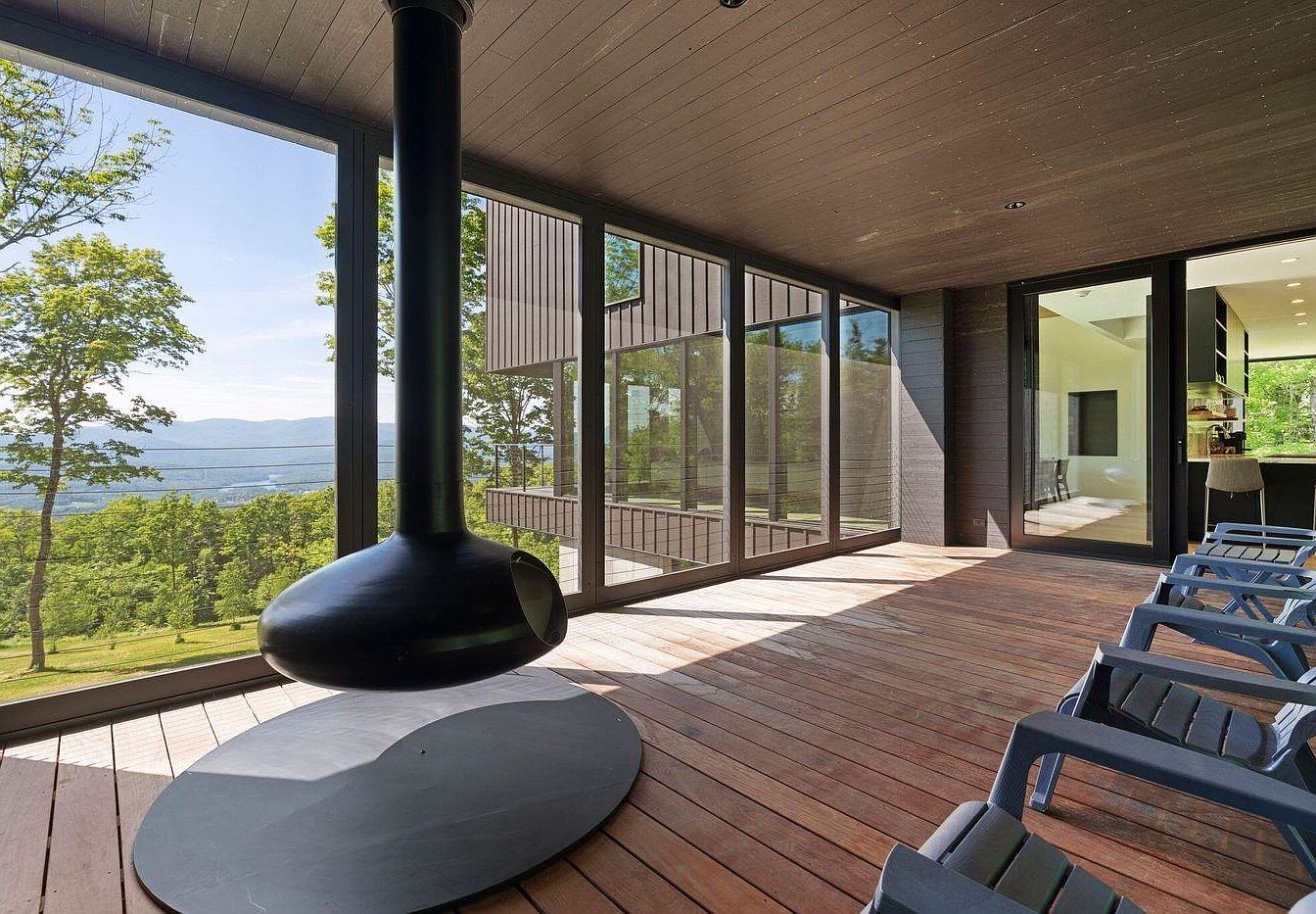 This inviting sunroom features floor-to-ceiling glass walls that frame breathtaking views of rolling hills and river valleys, seamlessly merging indoors with nature. The rich wooden flooring complements a dark-stained ceiling, creating a cozy, grounded ambiance. Sleek black lounge chairs are arranged to encourage conversation and family gatherings, while the suspended central fireplace adds a contemporary, minimalist touch and promises warmth during cooler evenings. The open plan connects with the kitchen, making it family friendly for easy supervision and shared activities. Natural light floods the space, enhancing its airy, tranquil, and welcoming aesthetic throughout.