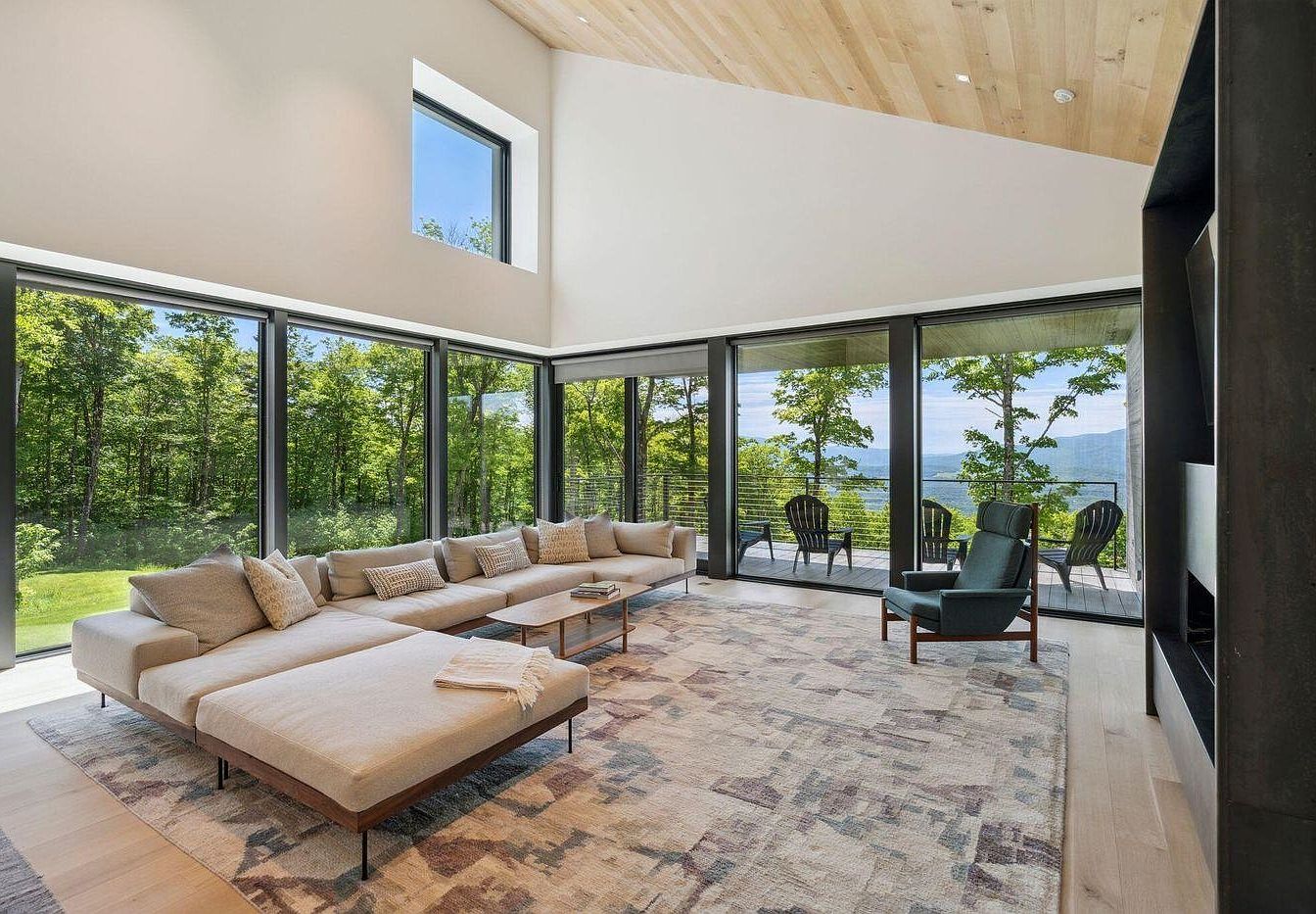 A spacious living room boasts floor-to-ceiling windows that seamlessly merge indoor and outdoor living, flooding the space with natural light and picturesque woodland views. The open layout features a large L-shaped sectional perfect for family lounging, complemented by soft, textured throw pillows and a cozy modern armchair. Warm wood tones from the ceiling and sleek wood flooring create inviting warmth, while a geometric area rug adds subtle artistic flair. The neutral color palette ensures a calming atmosphere, and the direct access to the patio enhances family-friendly entertaining and relaxation. Minimalist lines and high ceilings complete the airy, contemporary feel.