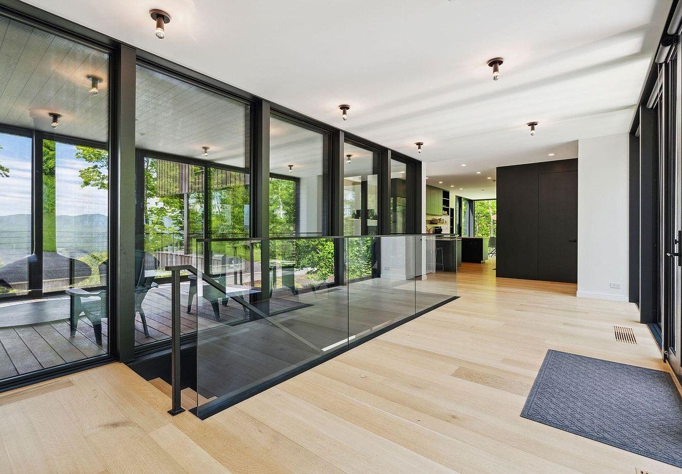 Expansive hallway with floor-to-ceiling glass walls seamlessly connects indoor and outdoor spaces, flooding the area with natural light and picturesque views. Light hardwood floors contrast elegantly with matte black trims and fixtures, creating a sleek, modern aesthetic. The glass railing maintains an open, airy feel while ensuring safety, making it suitable for families with children. Recessed lighting fixtures on the ceiling provide ample illumination without disrupting the minimalist design. The open plan leads directly to the kitchen, offering a smooth transition between spaces and encouraging family gatherings and easy movement throughout the home.