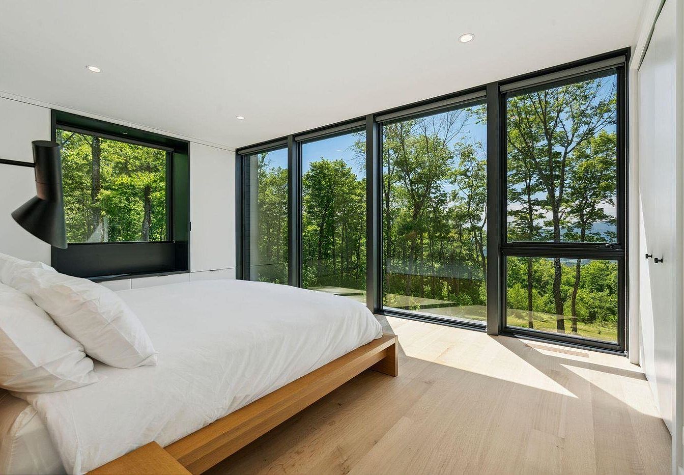 A serene bedroom boasting floor-to-ceiling windows that overlook a lush forest landscape, creating a seamless connection with nature. Minimalist design is showcased with clean white walls, recessed lighting, and a light wood platform bed topped with crisp white linens. Natural light floods the space, making it bright and airy, and the wide plank wood flooring adds warmth to the room. The simple black fixtures and modern built-in bench window seat offer both style and functionality. This tranquil retreat is spacious enough for a family, providing a peaceful environment and an inspiring view for both relaxation and play.