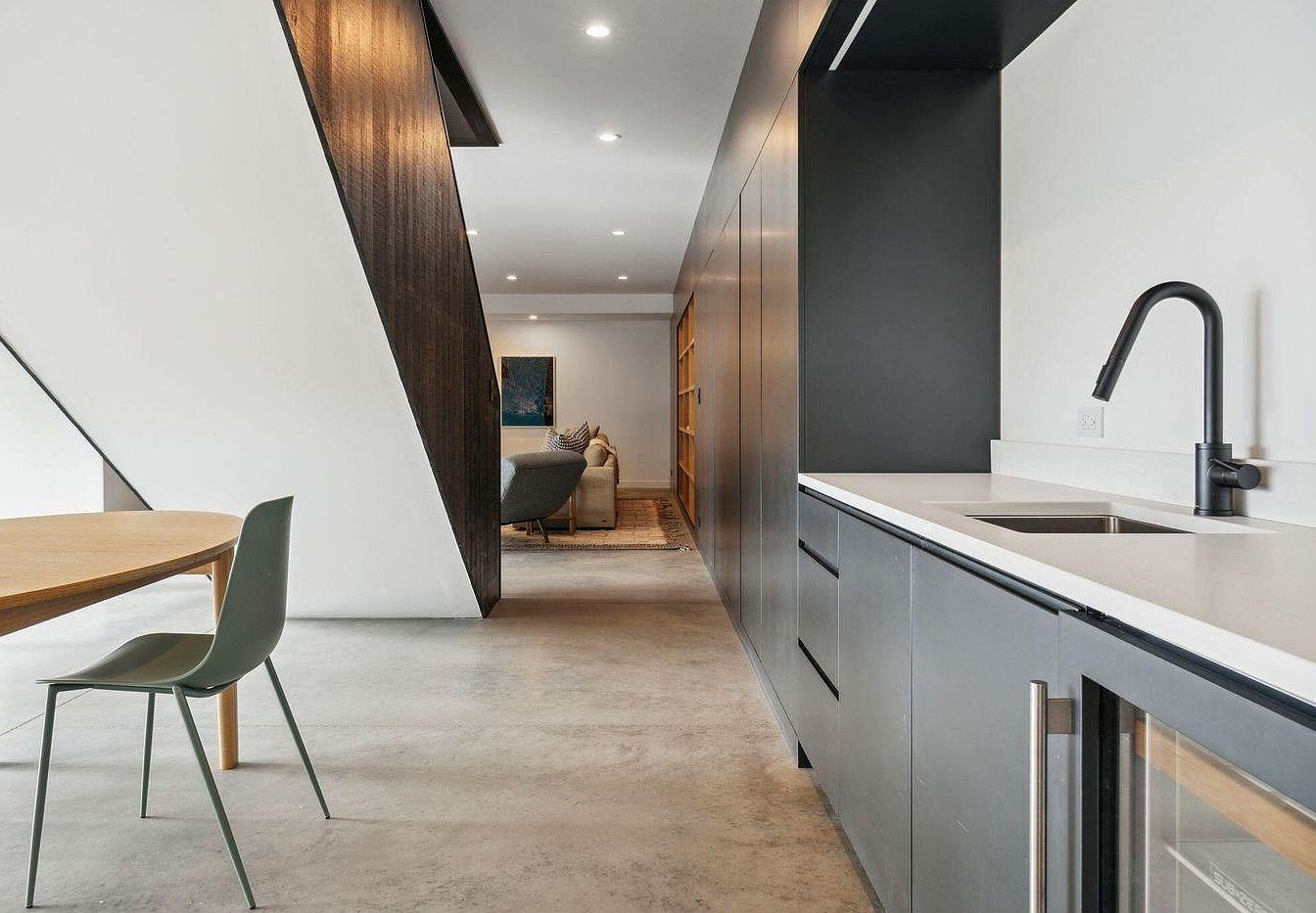 A sleek, modern kitchen connects effortlessly with the dining and living areas, creating an inviting open-concept space perfect for family gatherings. The kitchen features matte black cabinetry, a minimalist white countertop, and an undermount sink with a contemporary faucet. Adjacent to the kitchen, a simple wooden dining table and stylish gray chair provide a cozy eating area. The muted concrete floors, dark wood paneling under the staircase, and soft, neutral tones in the living room reflect a sophisticated yet family-friendly aesthetic. Open shelving and subtle recessed lighting make this area functional, welcoming, and visually balanced.