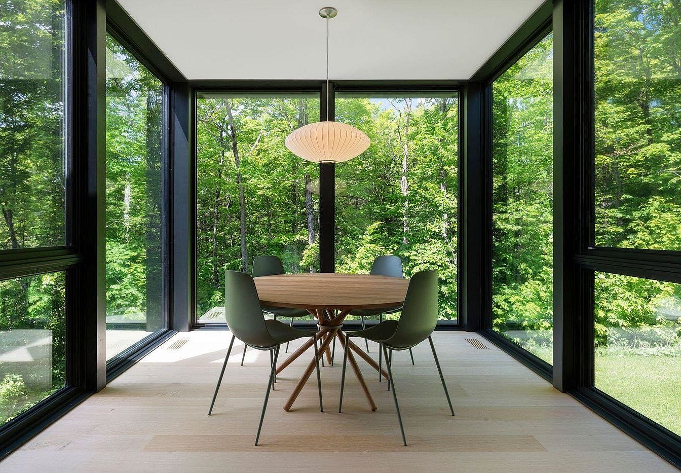 A modern dining area surrounded by floor-to-ceiling windows offers sweeping views of lush green woodlands, blurring the boundary between indoors and nature. The space features a round, light wood dining table paired with minimalist olive-green chairs, perfect for family meals or gatherings. Pale wood flooring enhances the airiness, while the black window frames add definition and contemporary flair. A sculptural pendant light hangs centrally, providing a soft, inviting glow. The uncluttered design and panoramic scene create a calming, family-friendly setting that encourages conversation and togetherness, making it a tranquil spot to enjoy every meal while feeling immersed in the outdoors.