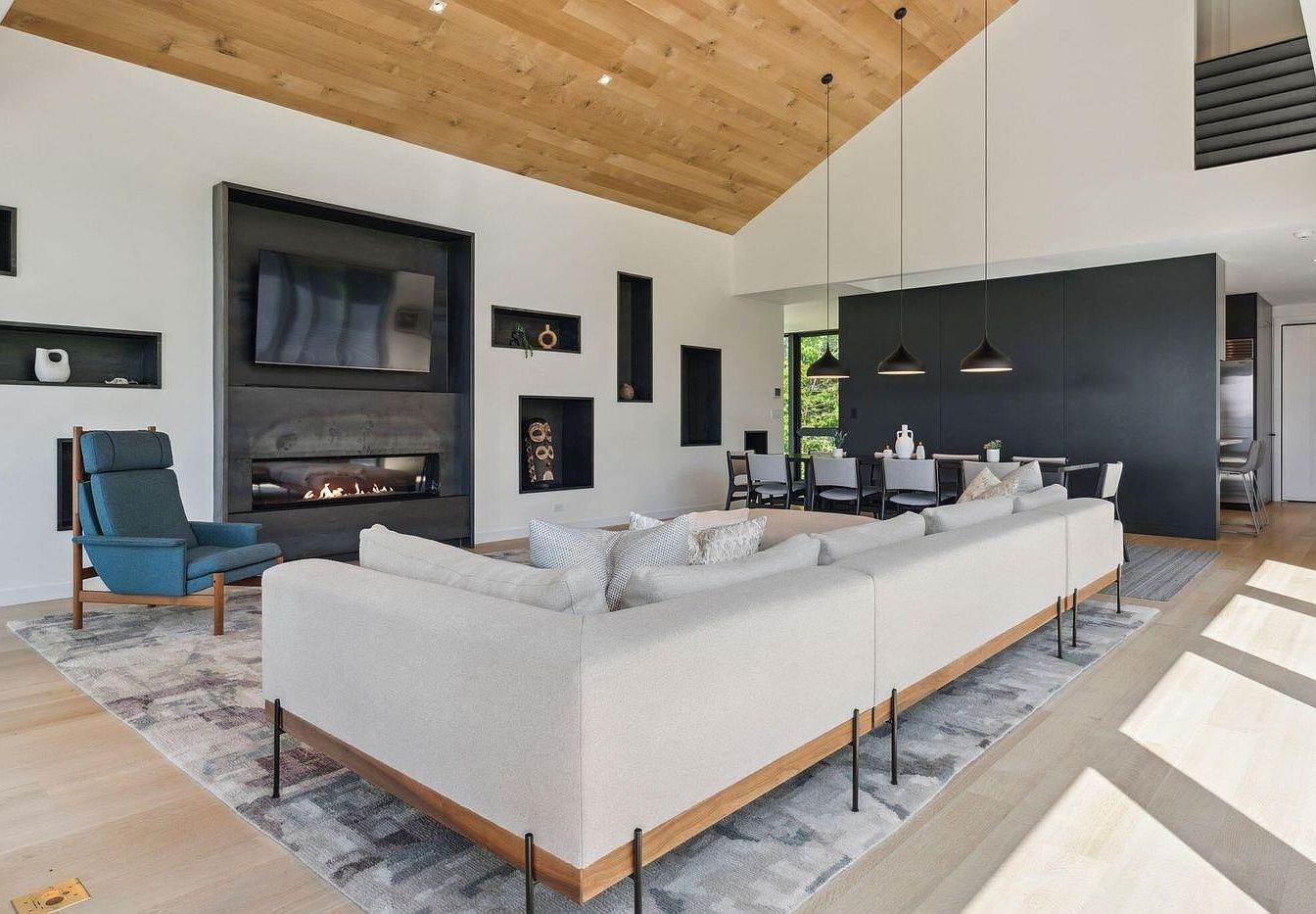 An open-concept living room seamlessly connects to the dining area, creating the perfect space for family gatherings or entertaining guests. High ceilings with wood paneling give a sense of spaciousness, accentuated by natural light streaming through large windows. A contemporary gas fireplace and built-in shelving add cozy character alongside practical storage for displaying decor. The soft, neutral sectional encourages lounging, while the blue accent chair adds a touch of color. Subtle patterns on the rugs complement the minimalist palette. The adjoining dining area features modern pendant lighting and a large table, ideal for family meals, crafts, or homework sessions.