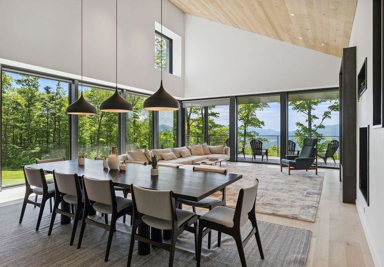 This space seamlessly blends living and dining areas, offering an inviting, airy atmosphere perfect for gatherings or family relaxation. Floor-to-ceiling windows frame serene woodland and mountain views, flooding the room with natural light. A large, dark wood table with softly upholstered chairs sits beneath stylish pendant lights, making the dining area both practical and chic. The adjacent living area features an L-shaped neutral sofa with cozy pillows, a subtle patterned rug, and modern lounge chairs, creating a comfortable spot for conversation or watching the scenery. Light wood ceilings and pale floors enhance the open, family-friendly environment with an organic, timeless elegance.