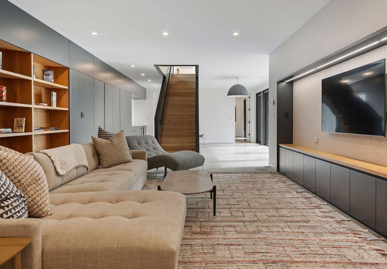 A spacious and inviting living room blends contemporary style with family-friendly comfort. A large, tufted sectional sofa in neutral beige is paired with soft, textured cushions, creating a cozy retreat for relaxing or gathering with loved ones. Built-in shelving with a natural wood finish lines one wall, providing storage for books and personal decor. A sleek media console and mounted television offer entertainment options, while the patterned area rug adds warmth to the space. Ample recessed lighting enhances the airy feel, and the open-concept layout seamlessly connects to the dining area and staircase, making the home feel connected and welcoming.