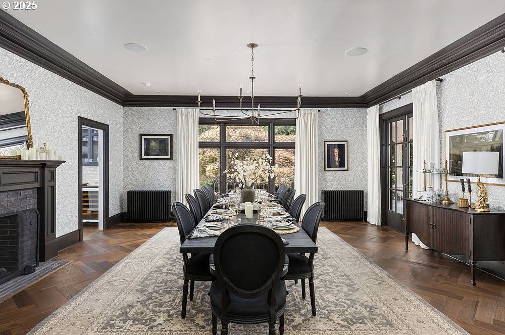 A sophisticated formal dining room features a long black dining table with seating for twelve, ideal for large family gatherings and entertaining guests. Elegant wainscoting, ornate crown molding, and a statement chandelier create a sense of grandeur, complemented by floor-to-ceiling windows dressed with crisp white curtains that fill the space with natural light. Warm herringbone hardwood floors paired with a classic area rug ground the space, offering durability and comfort for family meals. Wall art, a decorative fireplace, and a dark wood sideboard add character, while neutral tones and gold accents maintain a warm, inviting atmosphere suitable for all ages.