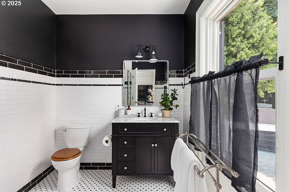 This inviting bathroom combines modern elegance with family-friendly functionality. Crisp white subway tiles are accented by striking black trim and a deep charcoal upper wall, creating a timeless monochrome palette. The expansive window ensures ample natural light, while sheer dark curtains lend privacy without sacrificing brightness. The double-sink vanity features classic cabinetry, stone countertop, and matte-black fixtures for a refined look. A polished wood seat adds warmth to the toilet area, while patterned tile flooring offers slip resistance for all ages. Fresh greenery atop the vanity enhances the room’s welcoming aura, making it both practical and stylish for daily routines.