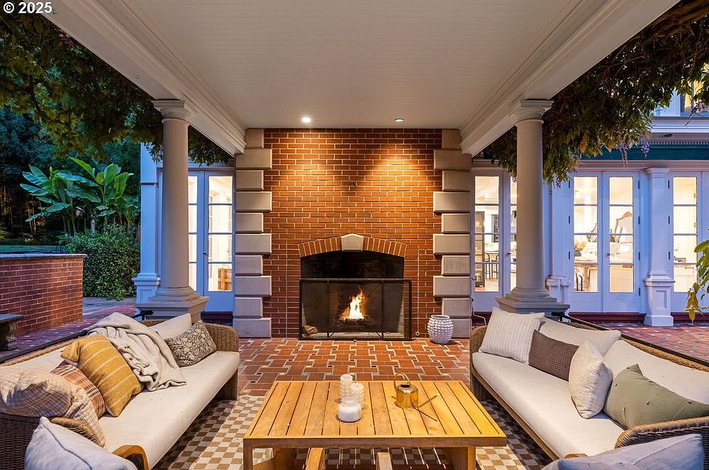 A welcoming outdoor patio featuring a prominent brick fireplace as the central focal point, perfect for cozy evenings with family. Comfortable cushioned sofas create an inviting seating area around a natural wood coffee table, complemented by soft pillows and warm throws in earth tones and muted colors. Classic architectural elements like stately columns and detailed brickwork enhance the space’s timeless elegance. French doors open directly into the interior, seamlessly connecting indoor and outdoor living. Lush greenery surrounds the patio, providing a sense of privacy and serenity, making this spot ideal for gatherings, relaxation, or enjoying the beauty of every season.