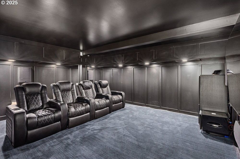 A dedicated home theater room features four plush, black leather recliners with diamond-stitched detailing, each offering built-in armrests and cup holders for optimal comfort during movie nights. The space is enveloped in deep, moody tones, with matte black paneled walls and ceiling enhancing the cinematic ambiance. Recessed lighting along the perimeter creates a soft, immersive glow without distraction. The spacious blue carpeted floor adds warmth and a family-friendly touch, making it inviting for gatherings of all ages. With ample room for additional seating or play area, this setup promises an ideal setting for shared entertainment experiences.
