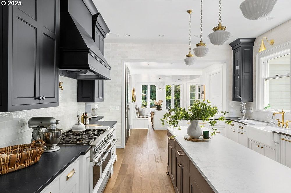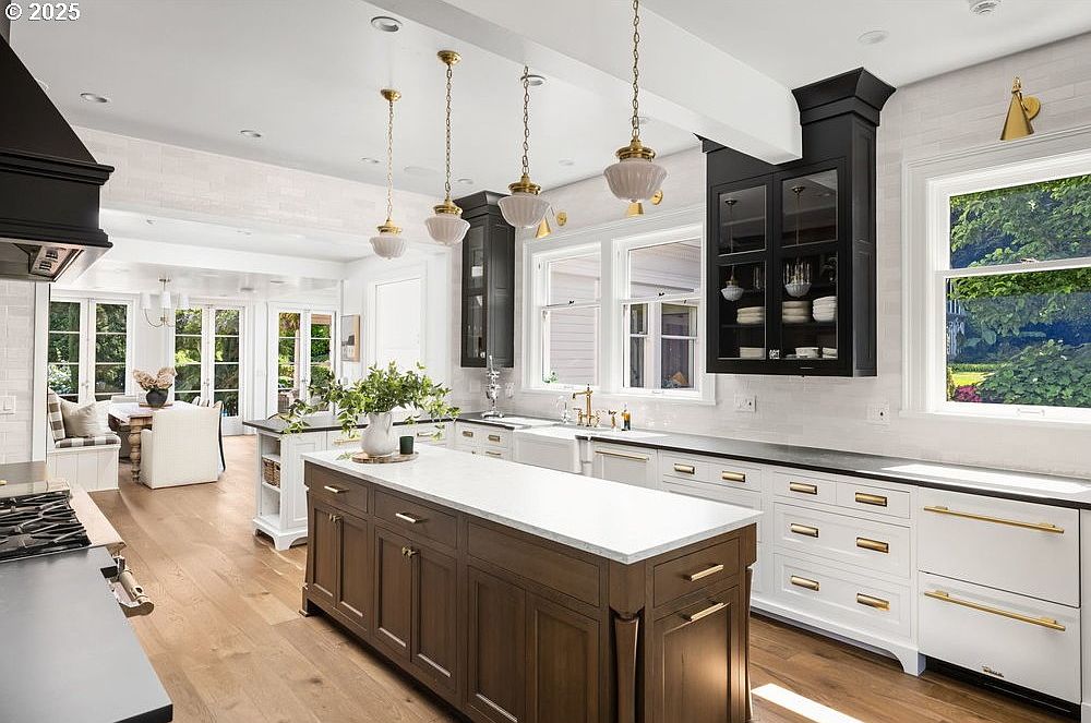 A spacious, light-filled kitchen blends classic sophistication with modern functionality, highlighted by a large central island that offers ample space for family gatherings and meal prep. Sleek black cabinetry contrasts with crisp white countertops and backsplash, while brushed gold fixtures and pendant lighting add a touch of elegance. Warm wood flooring ties together the contemporary and traditional elements, making the space inviting for both adults and children. Generous cabinetry maximizes storage, and the open layout provides easy access to the adjacent living area, promoting a seamless flow that is perfect for entertaining and daily family life.