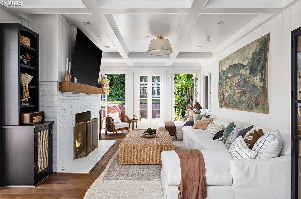 A bright and welcoming living room combines classic elegance with family comfort, highlighted by a white coffered ceiling, wood floors, and a large sectional sofa perfect for gatherings. Soft neutral tones are accented with earthy throws and patterned cushions, while a textured woven ottoman serves as both a coffee table and footrest. The white brick fireplace with a solid wood mantel anchors the space and is topped by a mounted TV for family entertainment. Large windows and glass doors flood the room with natural light, enhancing the tranquil, spacious atmosphere. Wall art and built-in shelving add character and practical storage.