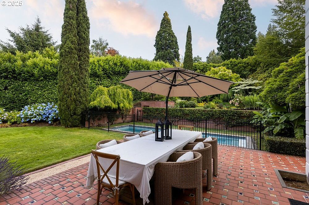 This elegant outdoor dining patio features a spacious brick-tiled terrace set against a backdrop of lush, manicured hedges and mature trees, offering privacy and tranquility. Centered under a stylish, oversized umbrella is a large rectangular table draped with a crisp white cloth, surrounded by comfortable, woven barrel chairs with plush cushions, perfect for family meals and gatherings. A safety fence encloses a sparkling pool, making the area both inviting and family-friendly. Fresh greenery, blooming hydrangeas, and impeccably tended garden beds create a picturesque setting, blending natural beauty with classic outdoor living and ample space for kids to play on the lawn.