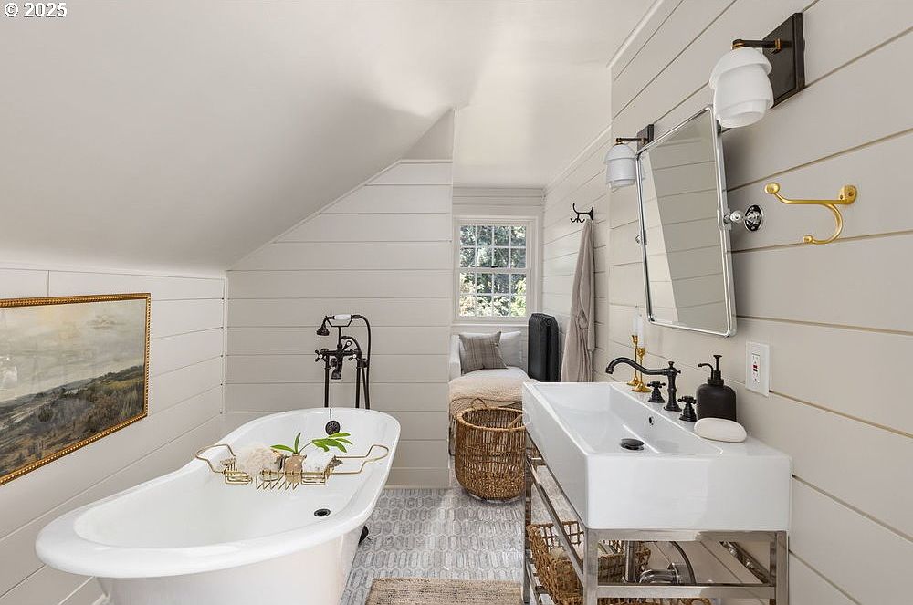 This bathroom features a soothing and welcoming ambiance, bathed in natural light from a window that highlights the shiplap walls painted in soft neutral tones. The free-standing clawfoot tub with elegant black fixtures provides a luxurious spot for relaxation, while a double sink adds functionality for families or busy mornings. Warm touches such as wicker storage baskets, a plush rug, and gold accents on the hooks inject charm and practicality. Carefully chosen wall art and streamlined lighting give the space personality without occupying valuable surface area, making it both stylish and user-friendly for daily routines.