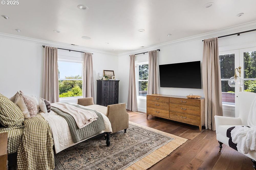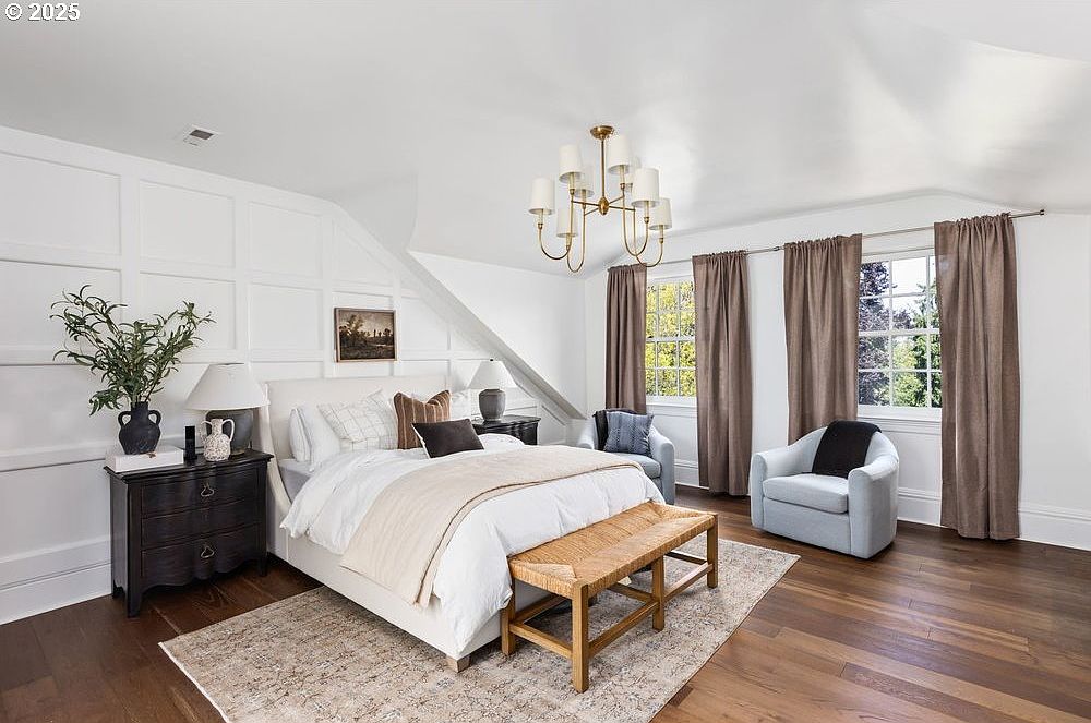 This bright and spacious primary bedroom suite blends classic and contemporary elements for a calming and inviting retreat. Crisp white paneled walls contrast beautifully with rich hardwood flooring, while soft beige and taupe accents in the bedding and curtains add warmth. The room centers around a plush bed flanked by elegant nightstands and reading lamps, perfect for relaxation. Two cozy armchairs by the window offer a quiet spot for reading or spending time with family. Large windows invite natural light, making the room feel open and airy, a perfect setting for both restful nights and leisurely mornings.