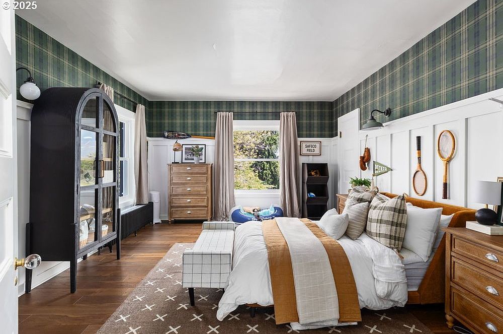 A well-appointed bedroom combines comfort and style with its inviting layout and playful touches. Rich parquet wood floors complement classic dark green plaid wallpaper above crisp white wainscoting. The bed is the room’s focal point, adorned with layered neutral-toned bedding, plaid pillows, and a caramel throw. Family-friendly features include a spacious area rug for play, open shelving for books and keepsakes, and sporty wall décor such as vintage tennis rackets and pennants, adding a playful, nostalgic vibe. Ample natural light streams in from a large window flanked by taupe curtains, illuminating wooden furniture and thoughtful storage solutions.