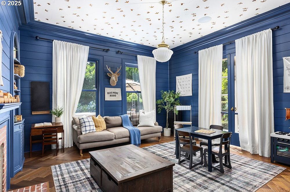 A vibrant and inviting family living room filled with natural light from large windows framed by elegant white curtains against deep blue paneled walls. The ceiling features whimsical golden birds, adding a playful touch perfect for families. The space centers on a plush, neutral-toned sofa layered with cozy throw pillows and blankets, accompanied by a classic wooden coffee table on a patterned rug. A small child’s activity table and a desk create spaces for learning and creativity, while plants and wall art add warmth and personality. The thoughtful design balances relaxation and function, creating an ideal environment for family togetherness.
