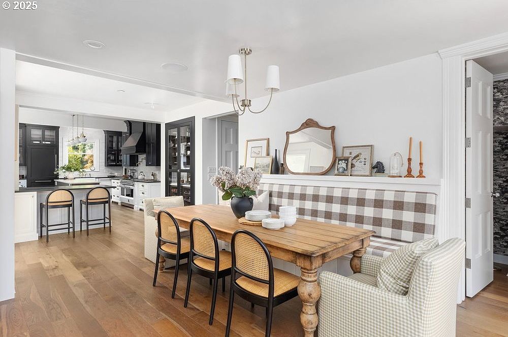 This warm, family-friendly dining nook flows seamlessly into a modern kitchen, creating an inviting open-concept space perfect for gathering. The nook features a rustic wooden table paired with a built-in checkered banquette and classic cane-back chairs, combining comfort and charm. Neutral tones, natural wood flooring, and a touch of greenery add freshness, while a decorative mirror and curated accents bring personality to the wall. The kitchen beyond features sleek cabinetry in black and white, a gourmet range, and a large island with additional seating, making it ideal for both everyday living and entertaining family or guests.